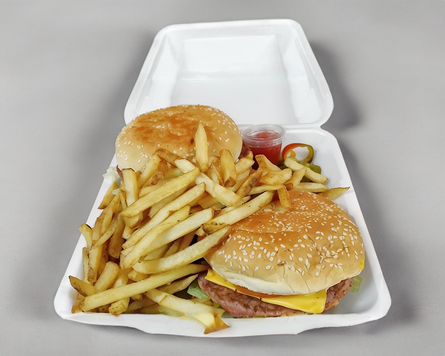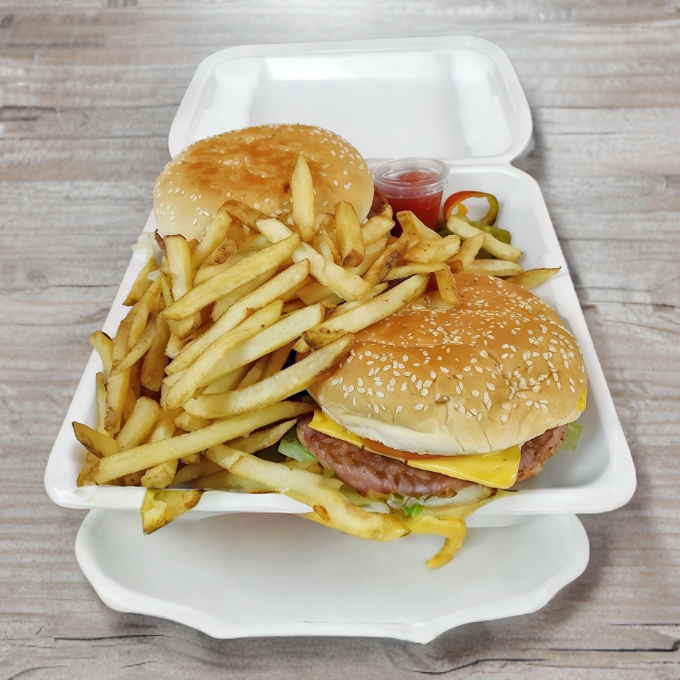 Una carne, queso amarillo, tomate, lechuga, jalapeño, catsup con papas.