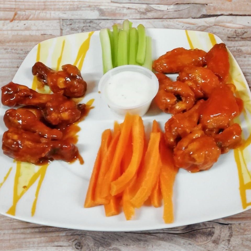 10 piezas de alitas en salsa bufalo acompañada con apio, zanahoria y aderezo ranch.