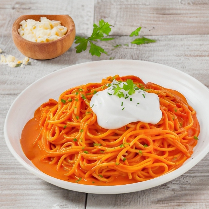 400 gr. Espaguetti con pasa de tomate, zanahoria, calabacita, jamón, queso mozzarella.