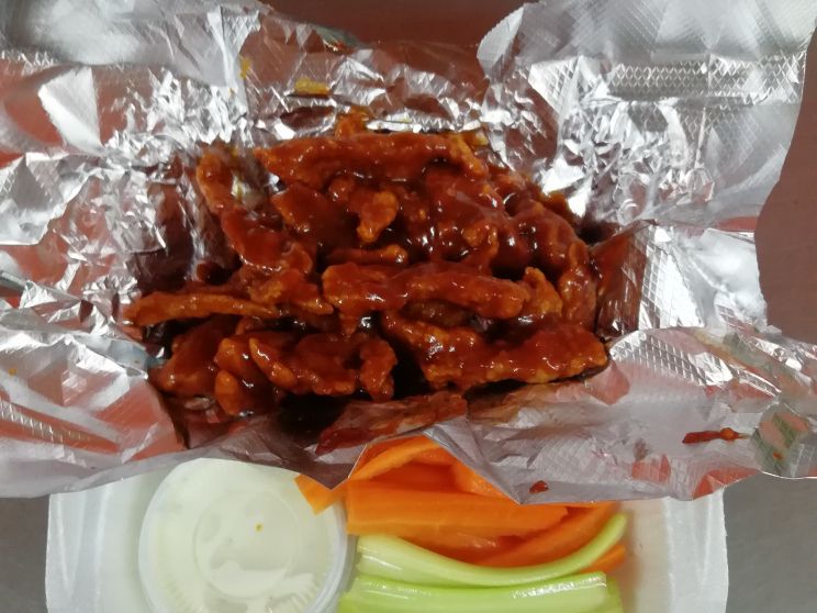Boneless bañados en salsa bufalo, lechuga, tomate, jalapeño, catsup con papas.