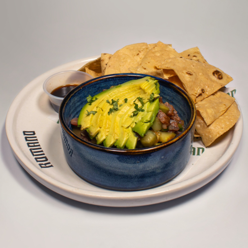 Ceviche preparado con atun fresco, acompañado de totopos y aguacate
