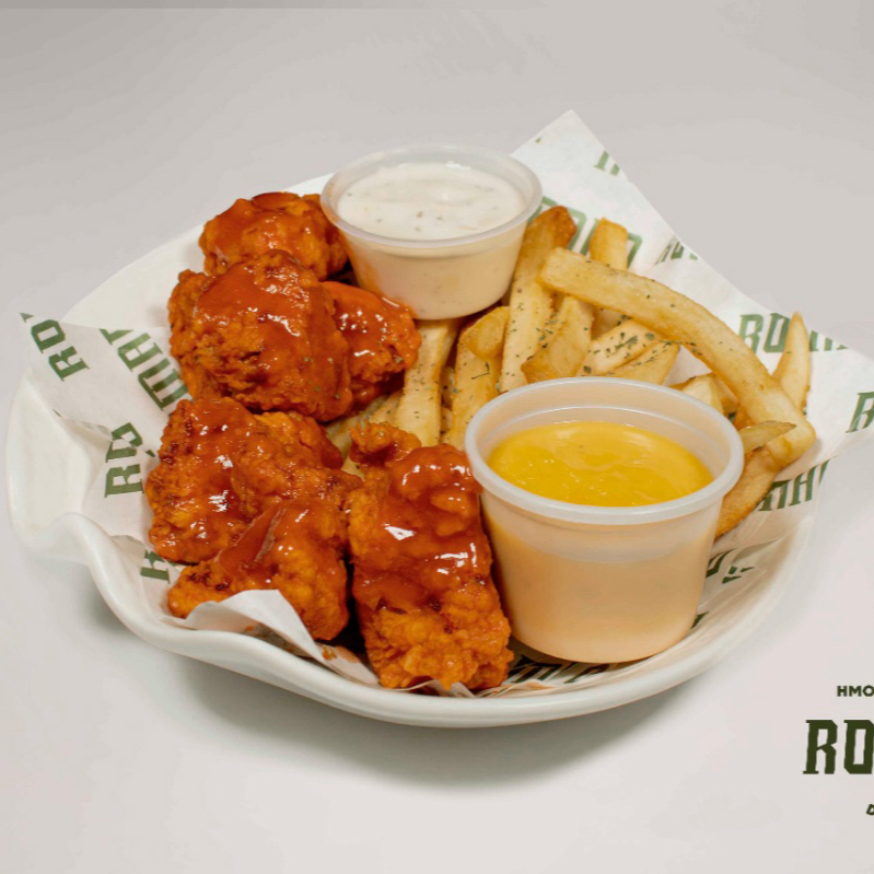 Pan blanco con boneless en salsa de preferencia, mezcla de queso. Acompañado de papas a la francesa.