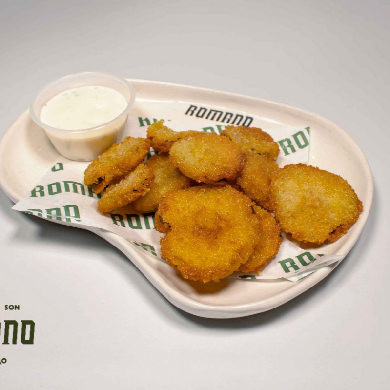 Pepinillos encurtidos fritos acompañados de aderezo
