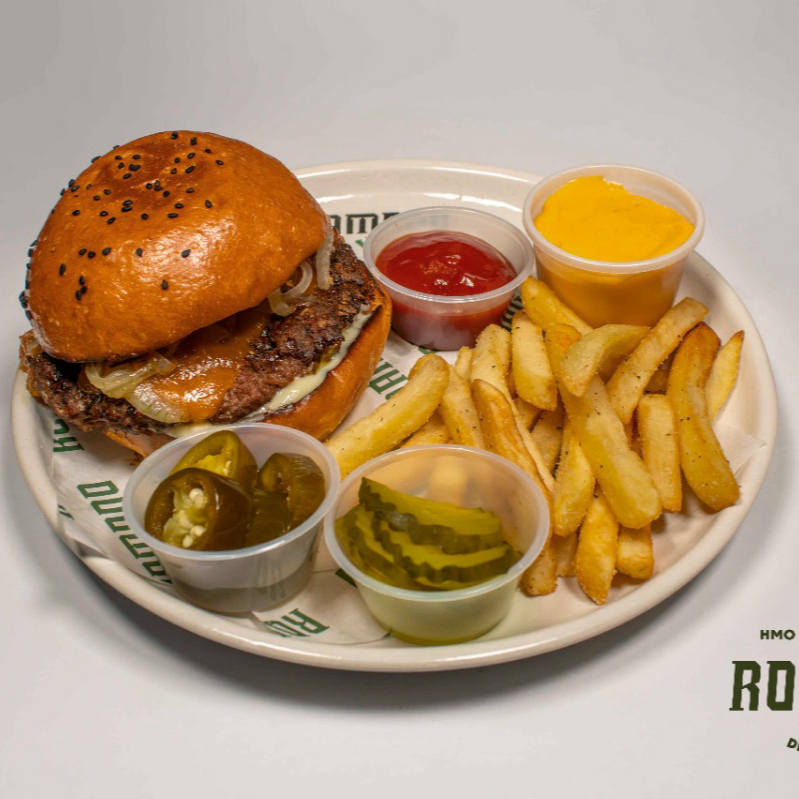 Hamburguesa de res (150 gr) con queso americano, pepinillos y cebolla asada, acompañada papas a la francesa.