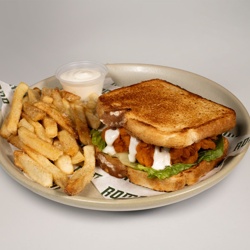 Hamburguesa de pollo estilo tender con aderezo y compañado de papas a la francesa