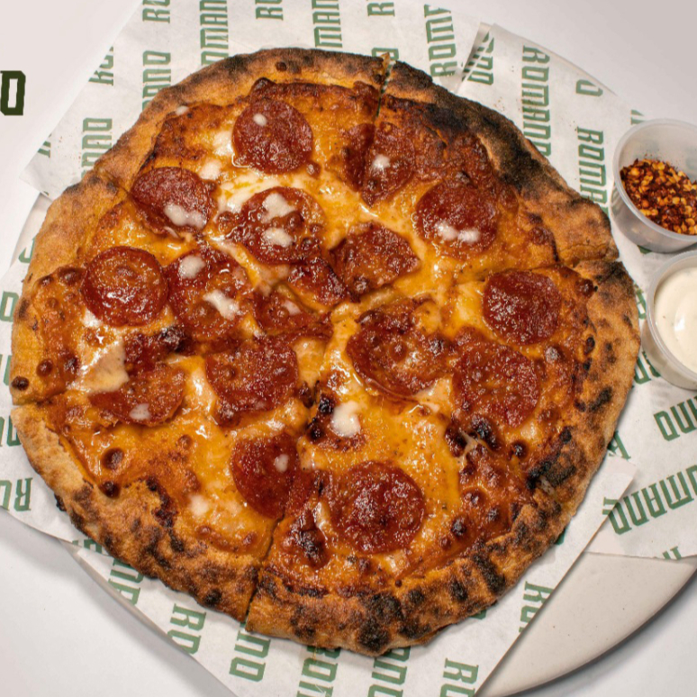 Salsa de tomate, queso mozzarella fresco y pepperoni.