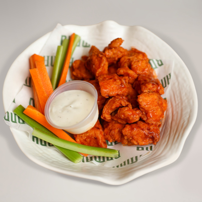 Tiras de pollo empanizadas con salsa de su eleccion, acompañadas de zanahoria,y aderezo ranch.