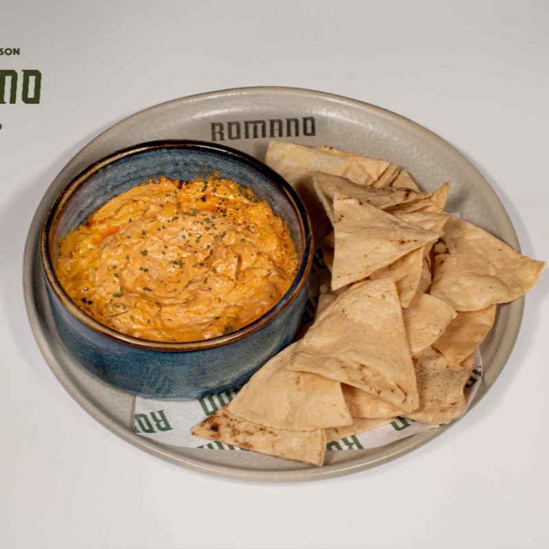 Dip preparado de pechuga de pollo en salsa bufalo y mezcla de quesos, acompañado de totopos.