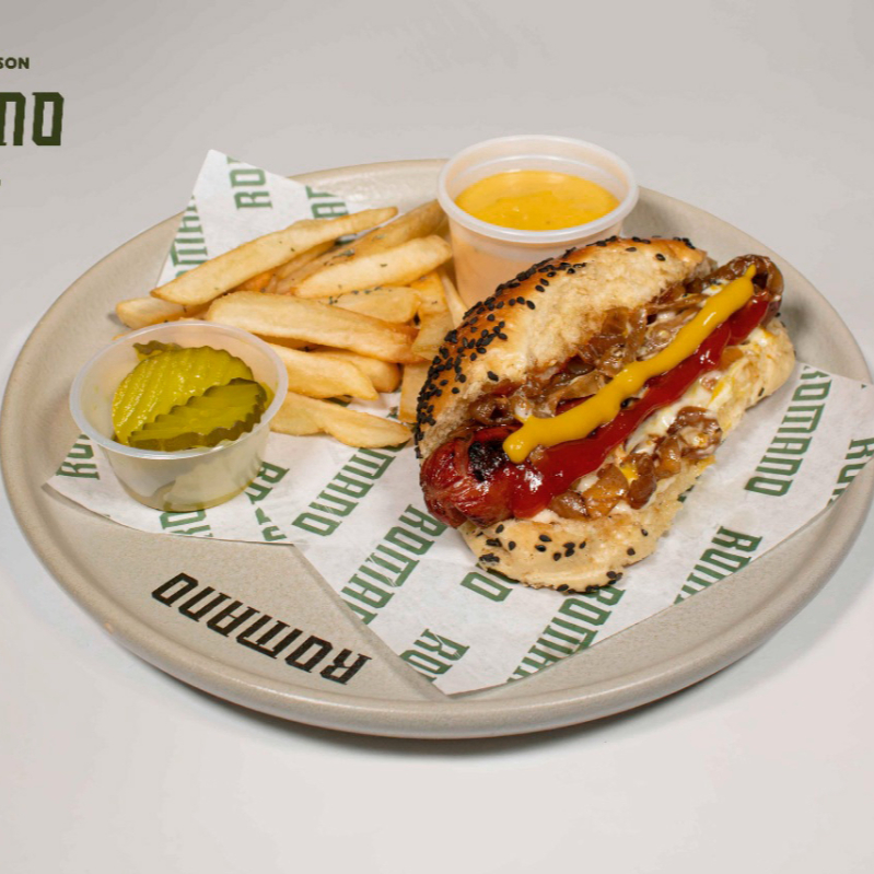 Dogo con salchicha de res, cebolla caramelizada y acompañado de papas a la francesa.