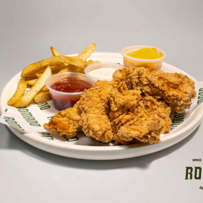 Tiras de pollo empañizadas, acompañado de papas a la francesa, aderezo ranch y salsa de su preferencia.
