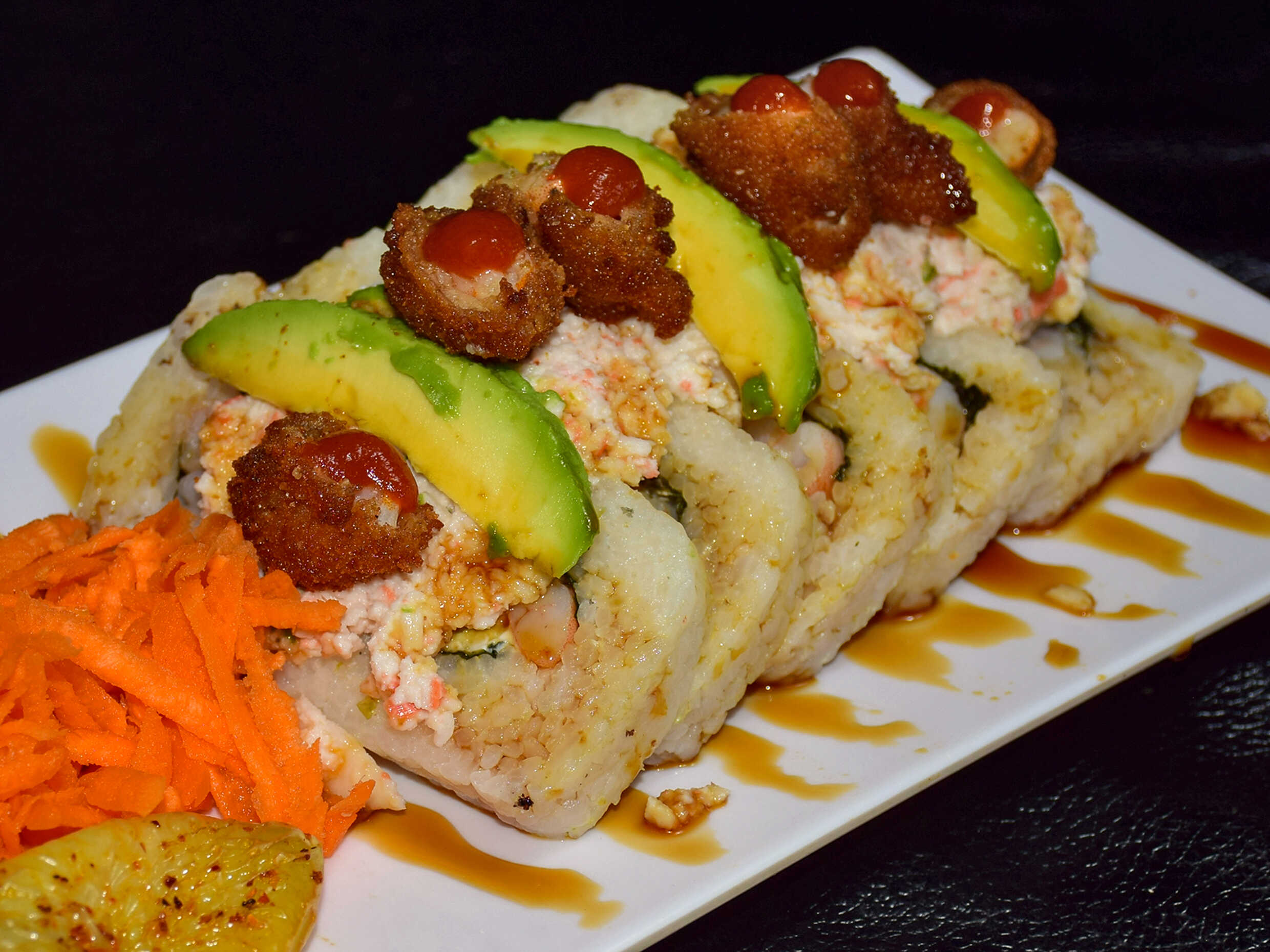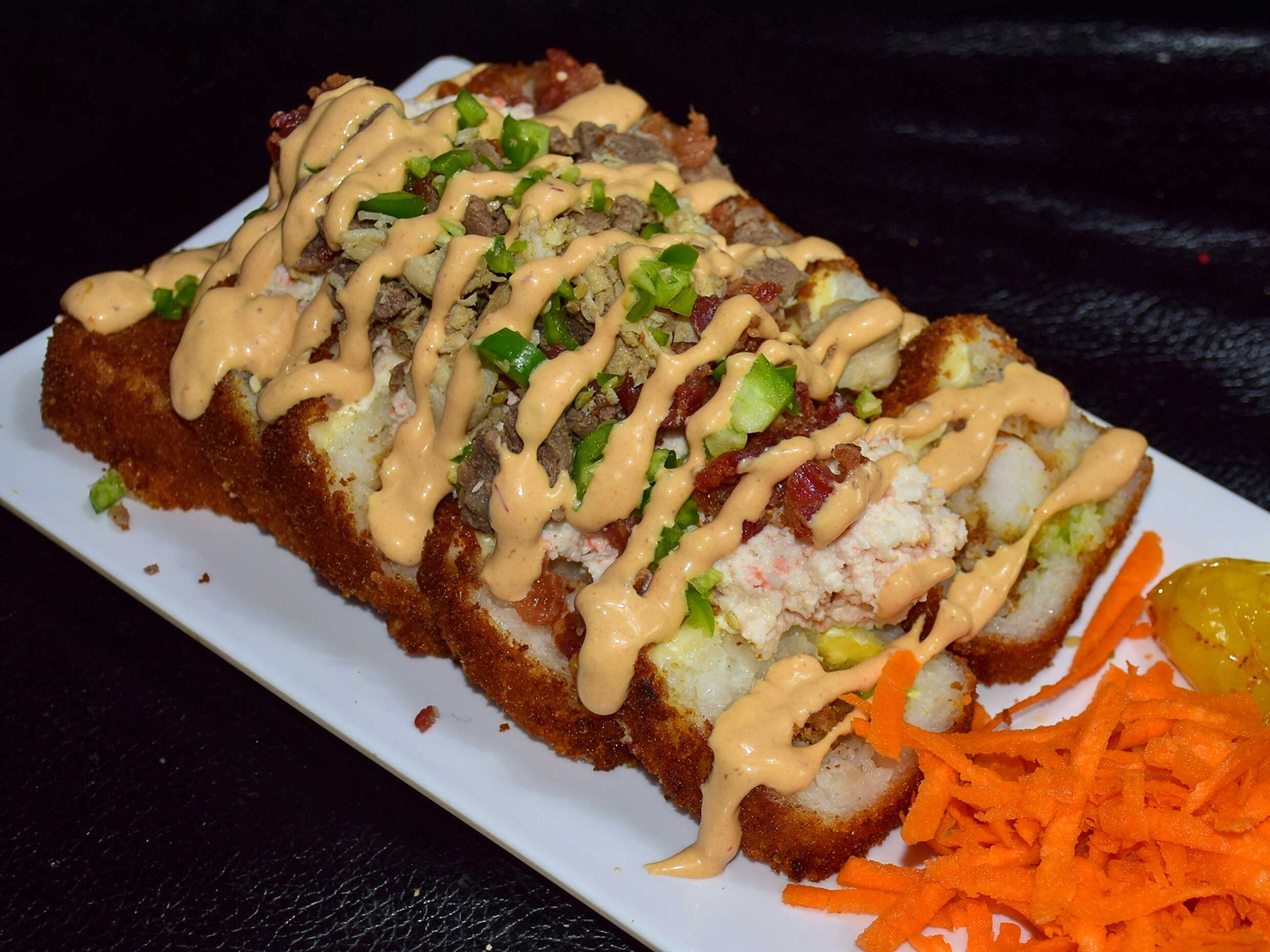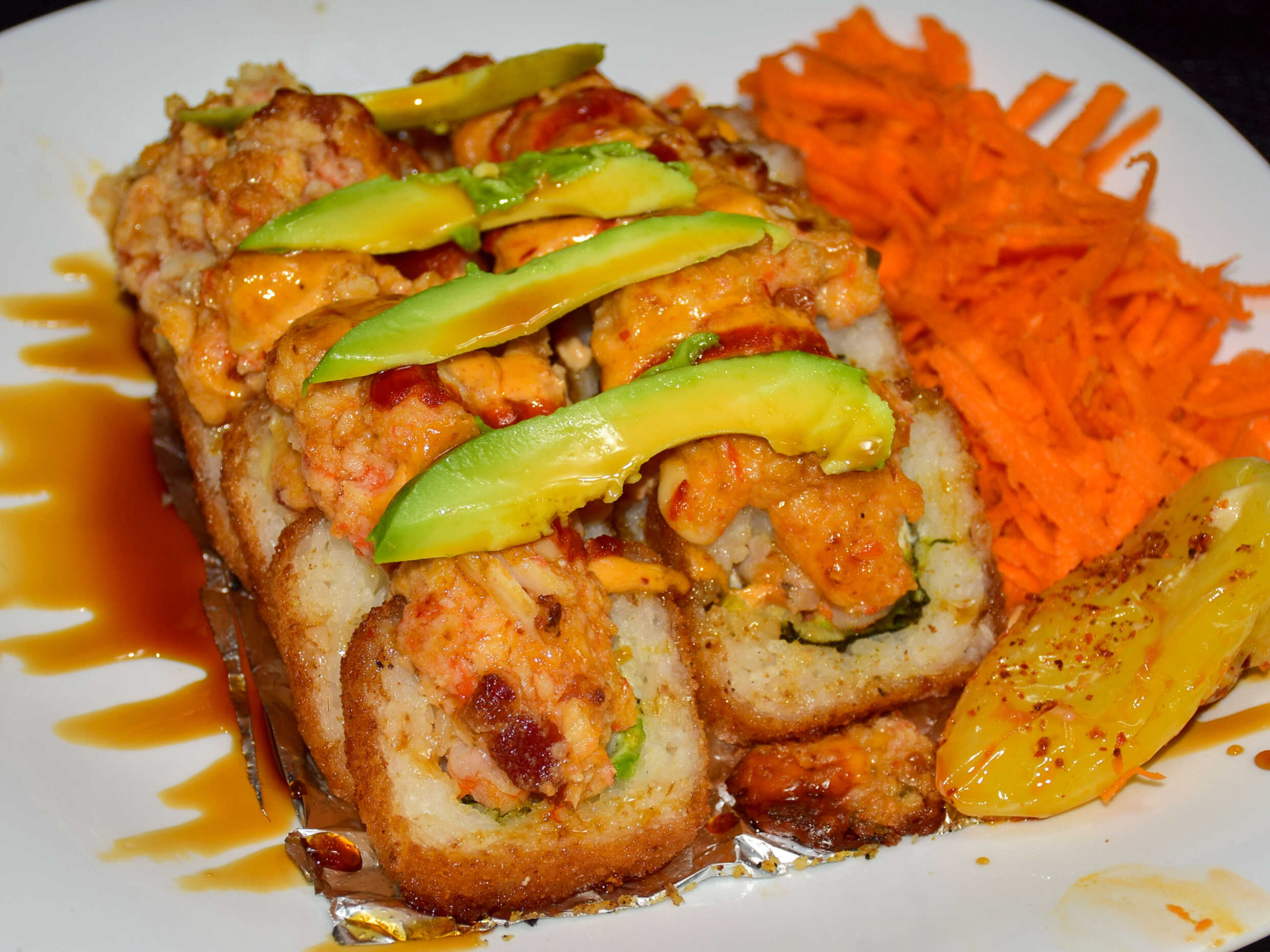 Por dentro philadelphia, aguacate, camarón empanizado, por fuera queso chihuahua, tocino, serrano, arriba tampico, res, pollo, tocino, chile caribe, bañado en aderezo chipotle.