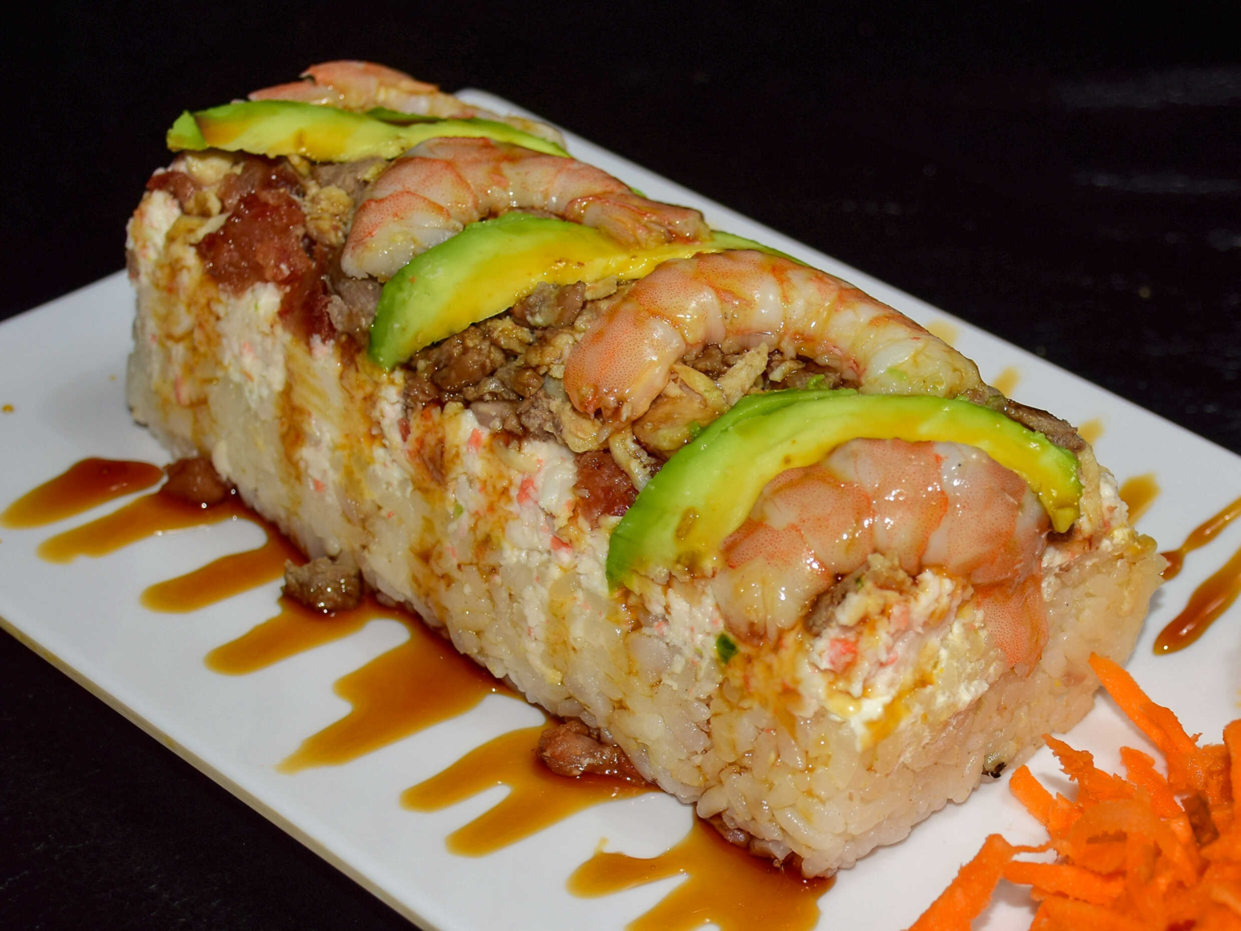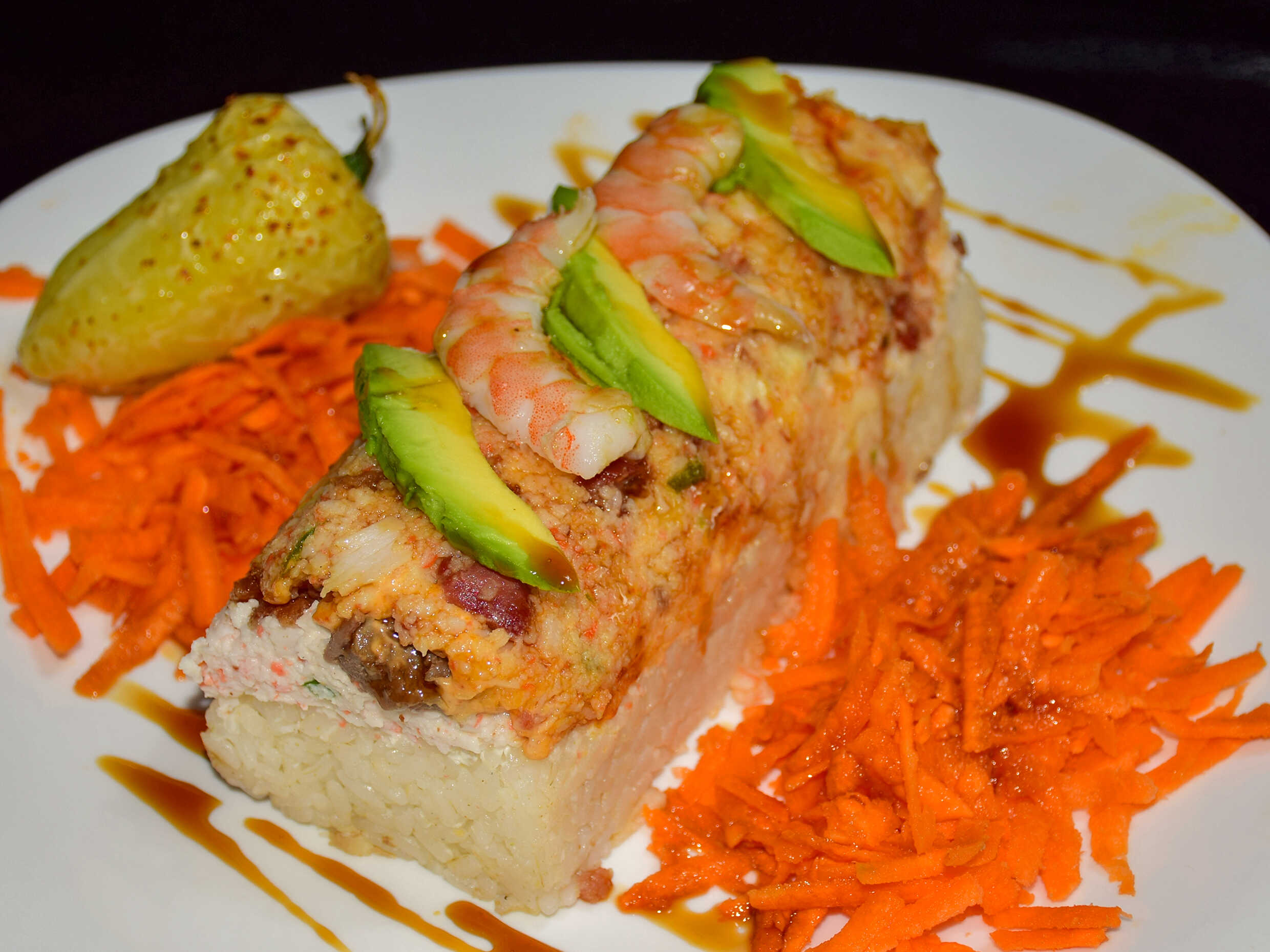 Por dentro philadelphia, aguacate, camarón, pollo, res y tocino, por fuera una pasta horneada de camarón, queso chihuahua, tocino y tampico.