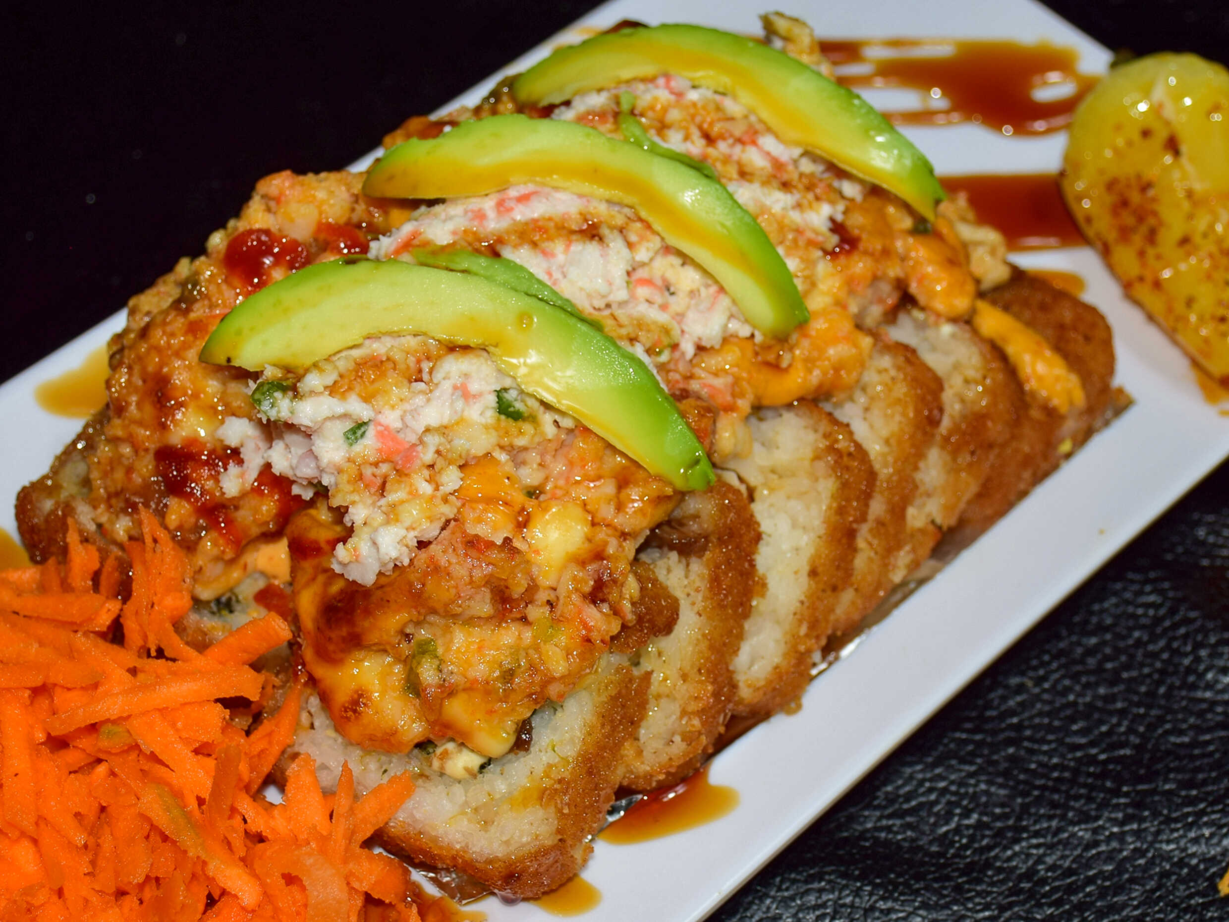 Filadelfia, aguacate, camaron, pepino por dentro, kanikama preparado en salsas con queso chihuahua y horneado por fuera.
