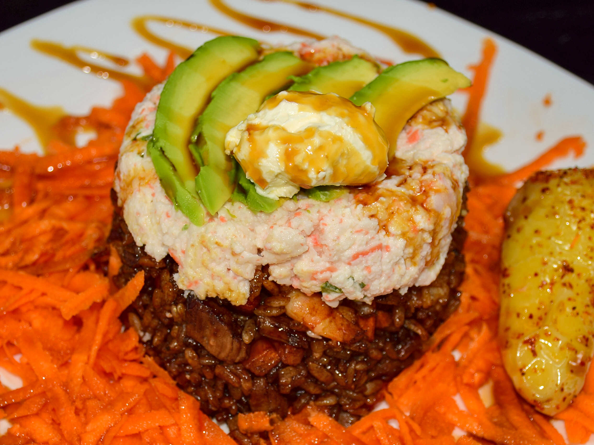 Arroz frito, con zanahoria, cebolla, pollo, res, camarón, tocino, tampico, aguacate, filadelfia, salsa de anguila.