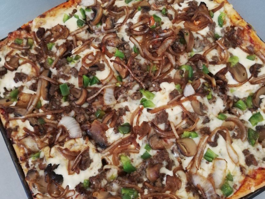 Pizza con queso Philadelphia, champiñones, cebolla caramelizada, pimiento verde, carne a elegir, pollo, pastor o carne asada, salsa tradicional y aderezo.