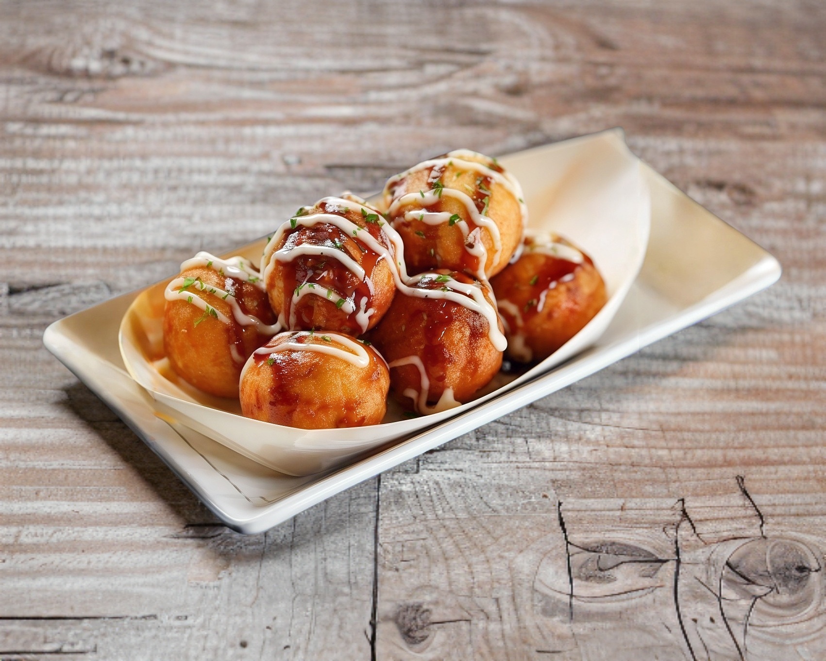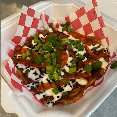 Conocido como "pizza japonesa" base de huevo, col, harina; cocinado a la plancha. Bañado de salsa de anguila, mayonesa y pepperoni.