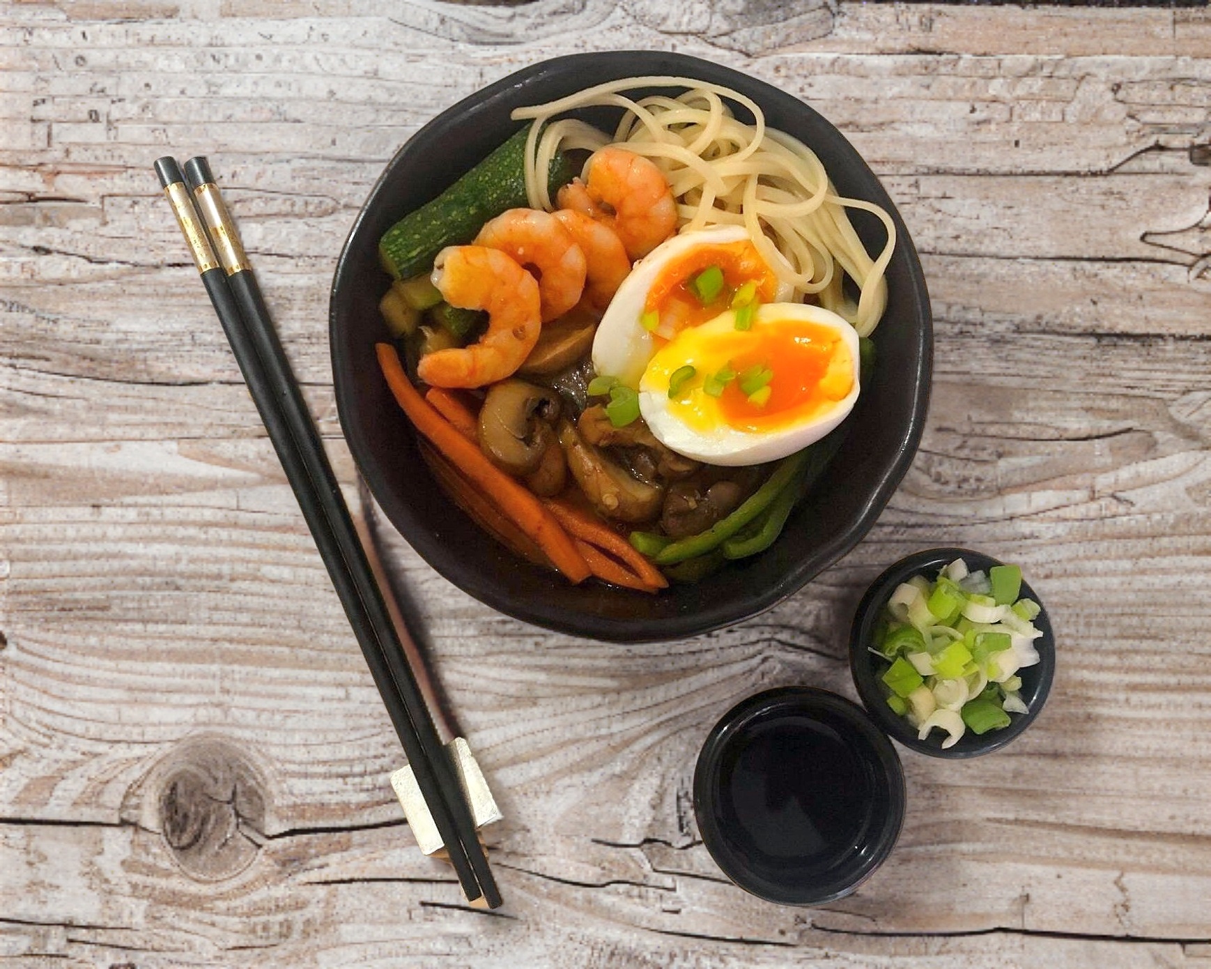 Noodles tipo ramen en base tonkotsu (caldo cremoso de cerdo), huevo, zanahoria, calabaza, grano de elote y proteína a su elección (camarón, pollo o cerdo).