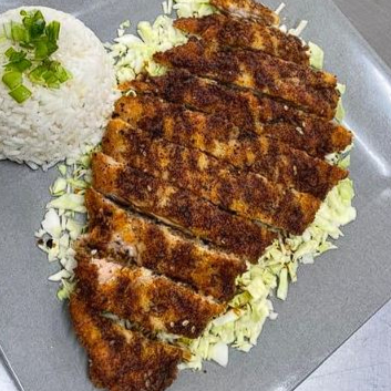 Filete de cerdo empanizado, cortado en tiras bañado en salsa de anguila acompañado con arroz y repollo.