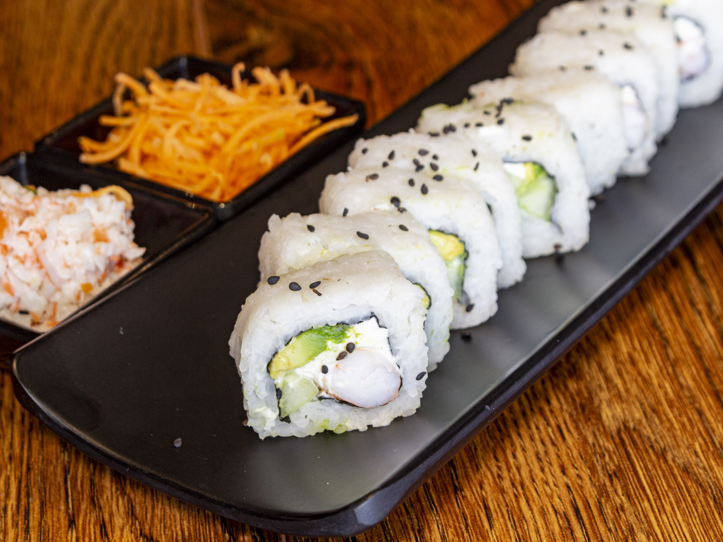 Por dentro: Camarón, queso crema, aguacate y pepino. Por fuera: Cubierto con ajonjolí.