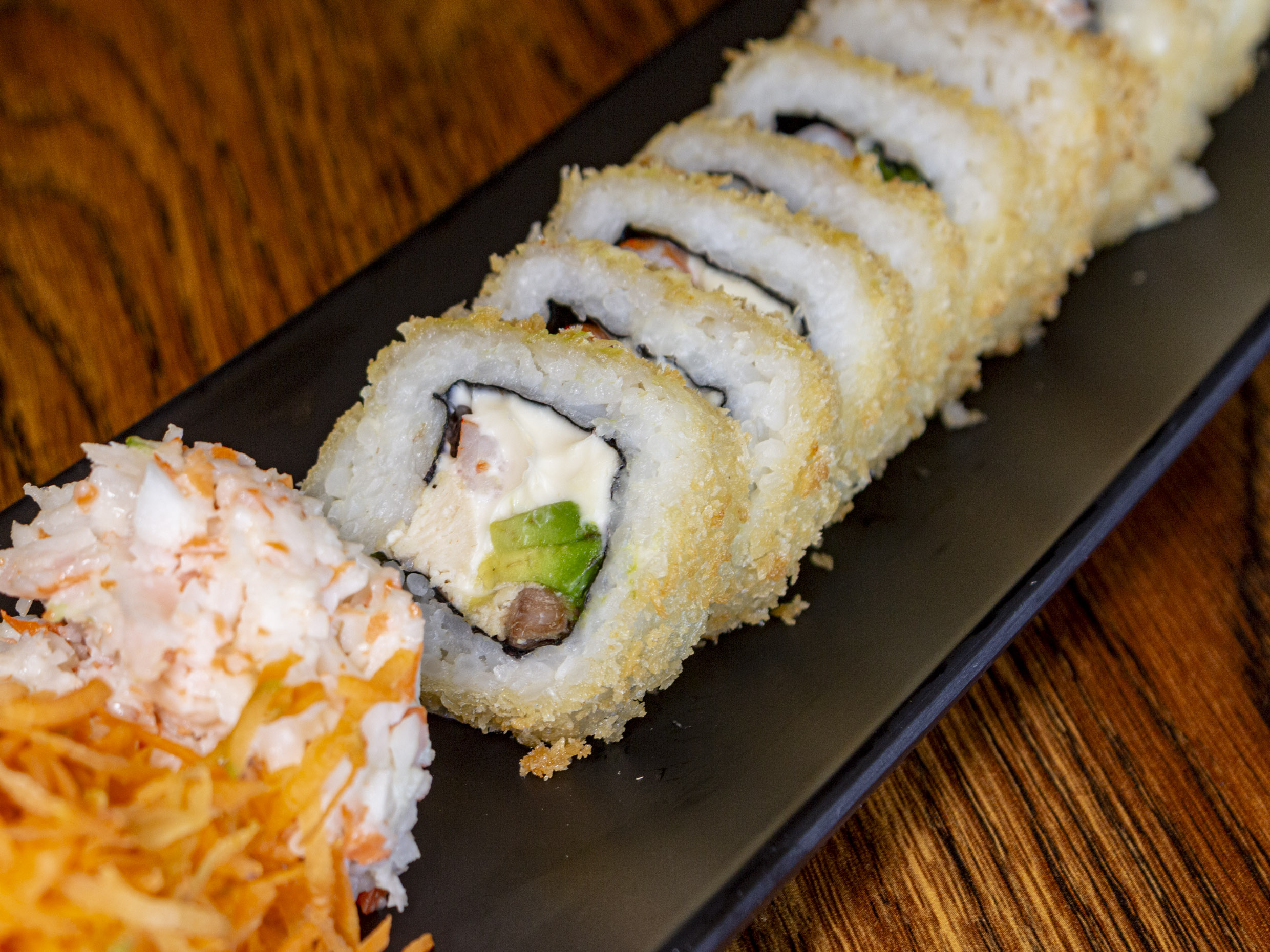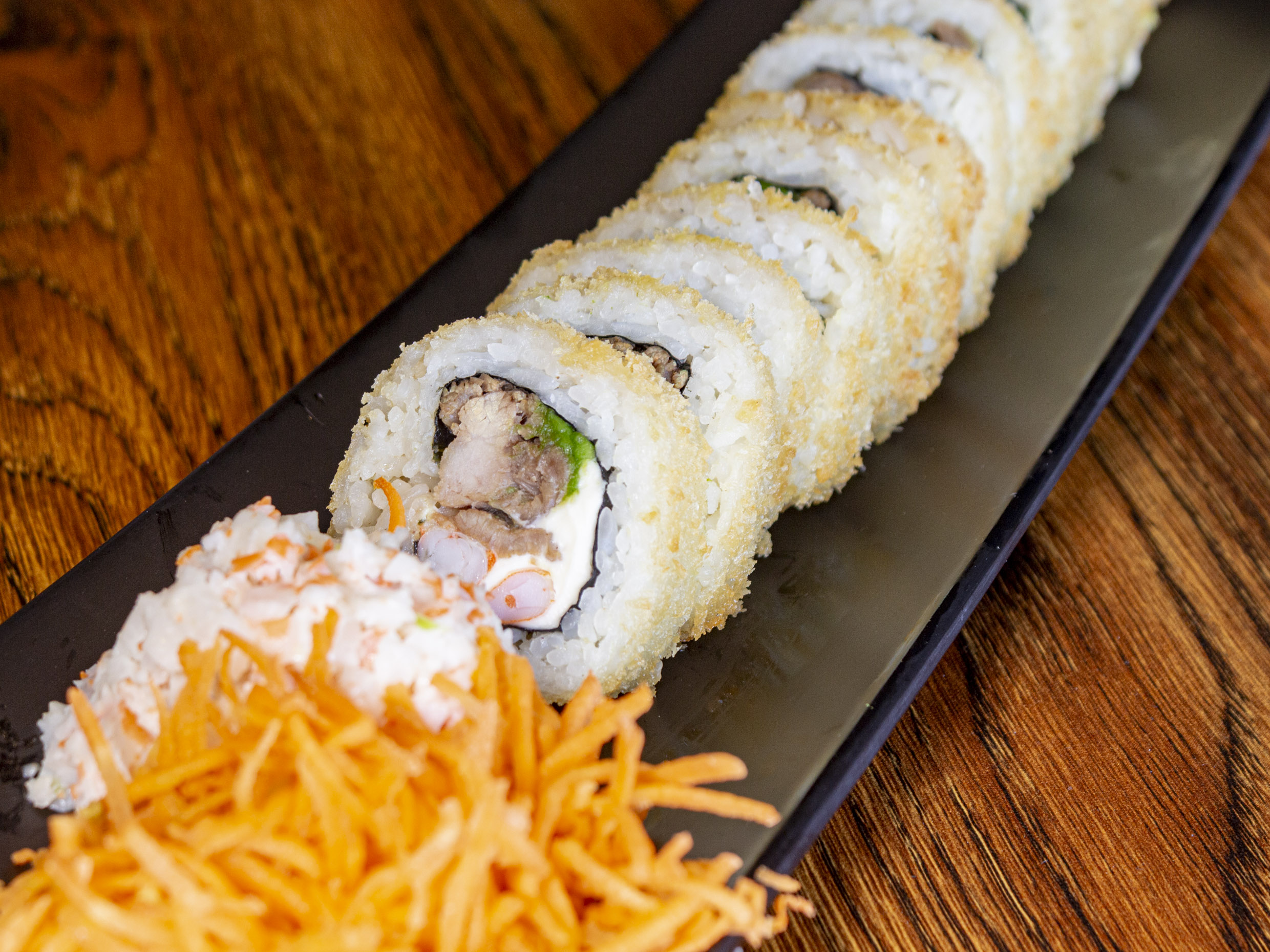 Por dentro: Camarón, res, aguacate y queso crema. Por fuera: Empanizado crujiente.