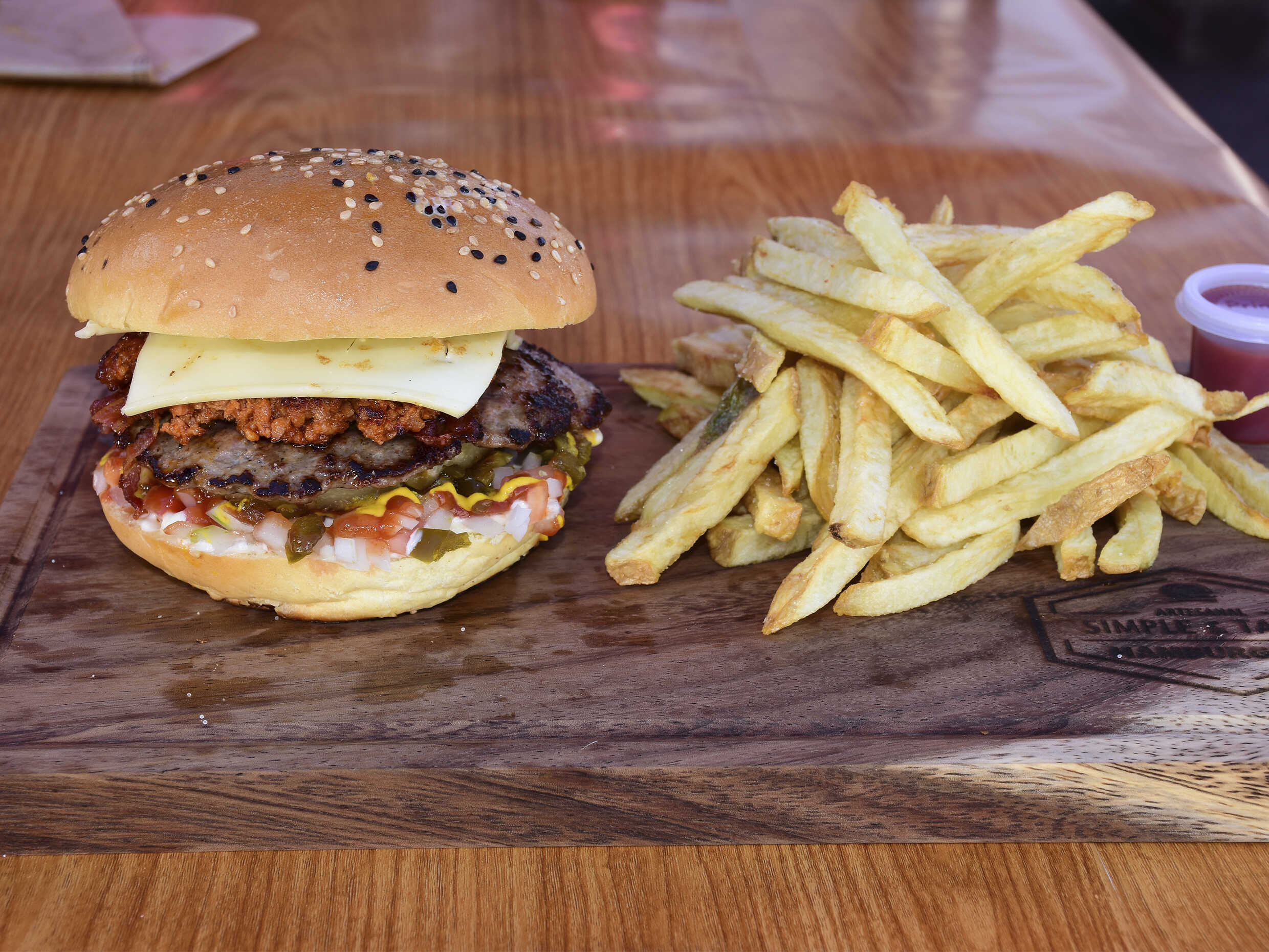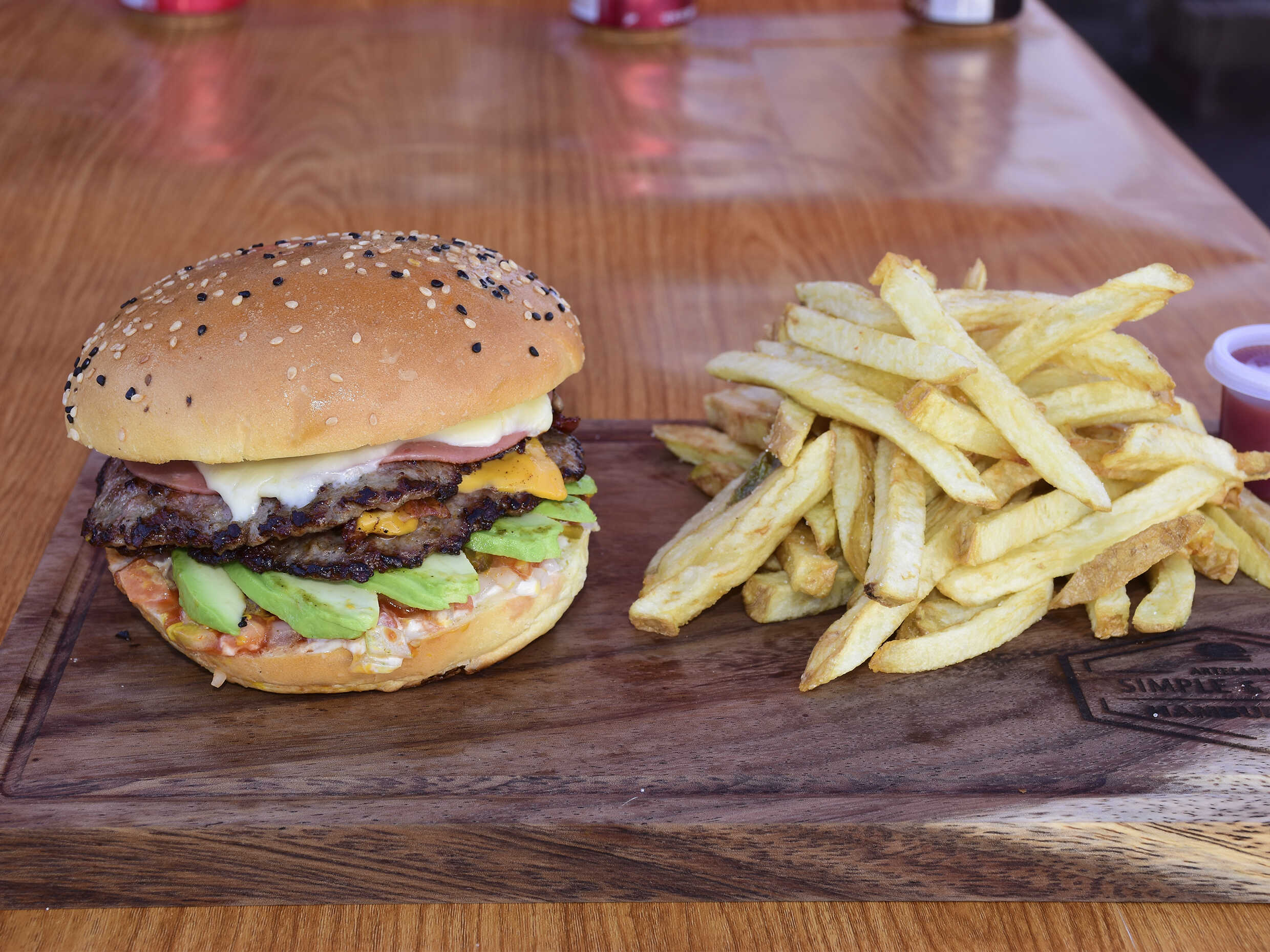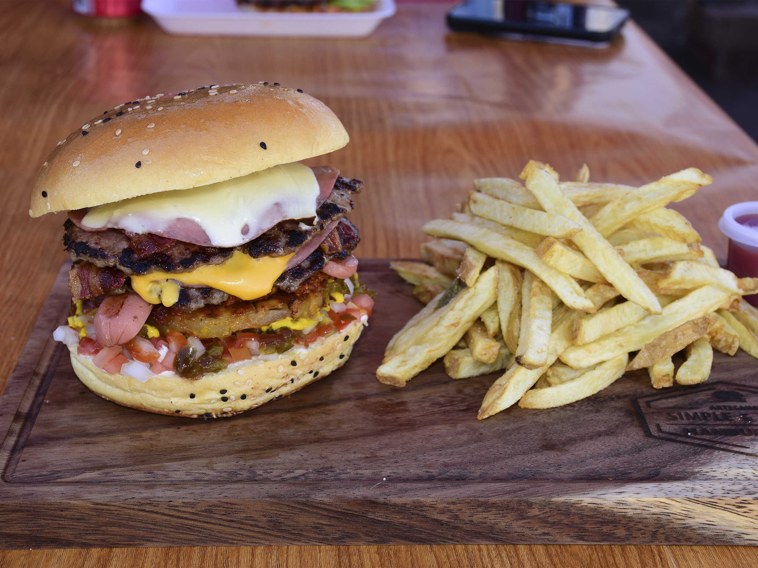 2 Carnes, tocino, 2 quesos amarillos, tomate, cebolla, jalapeño, kétchup, mostaza y mayonesa. Incluye papas a la francesa.