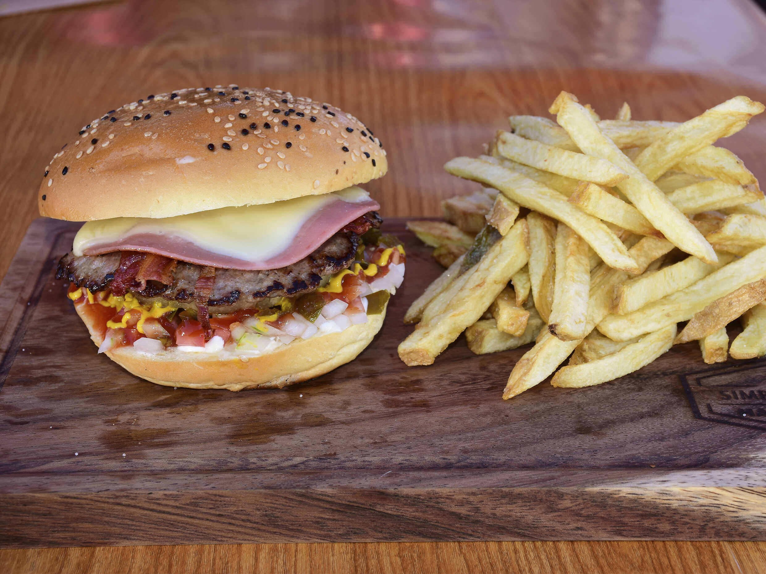 Carne, queso, tomate, cebolla, jalapeños, kétchup, mostaza y mayonesa. Incluye papas a la francesa.