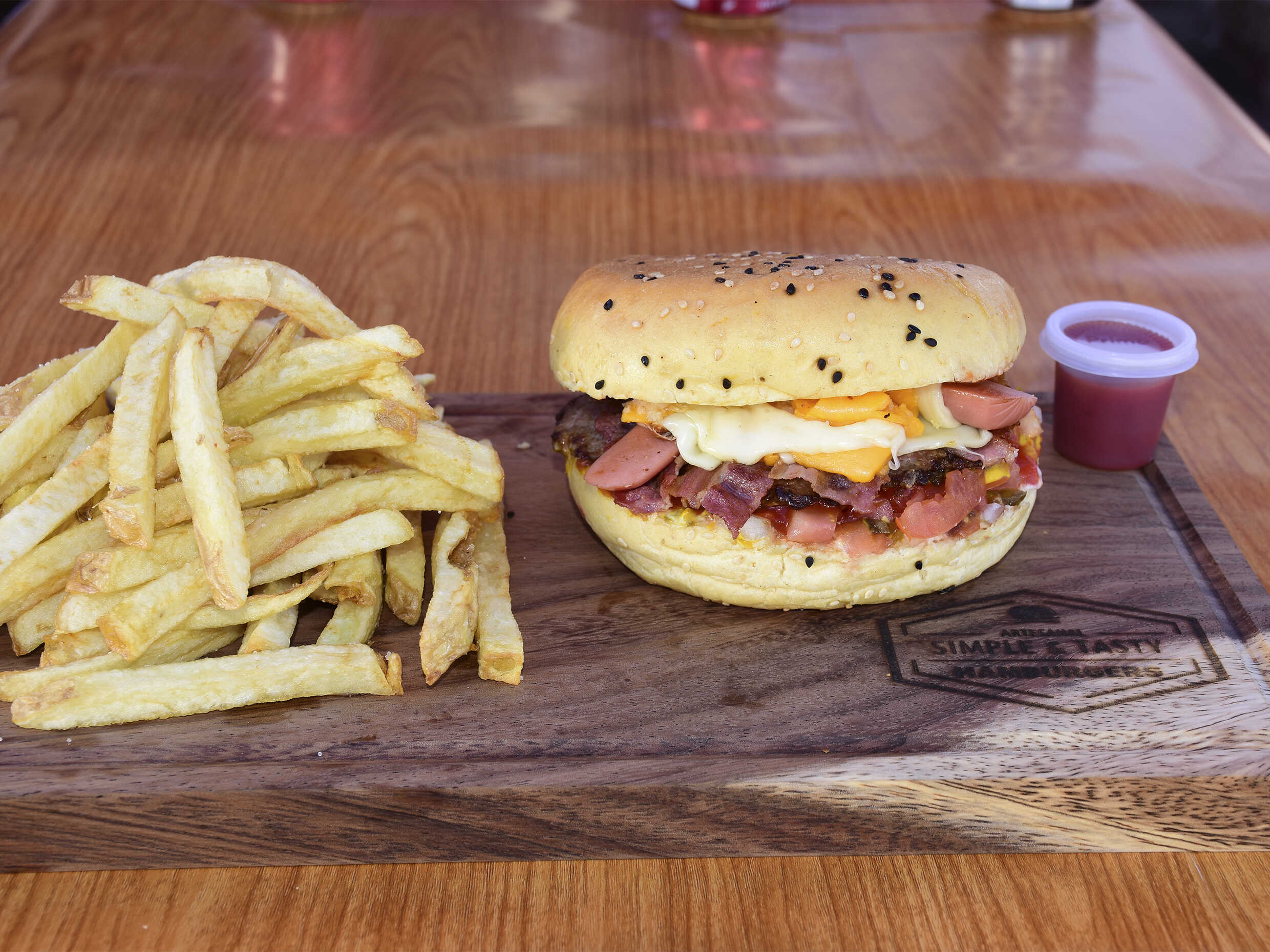 Carne, queso, tocino, tomate, cebolla, jalapeños, kétchup, mostaza y mayonesa. Incluye papas a la francesa.