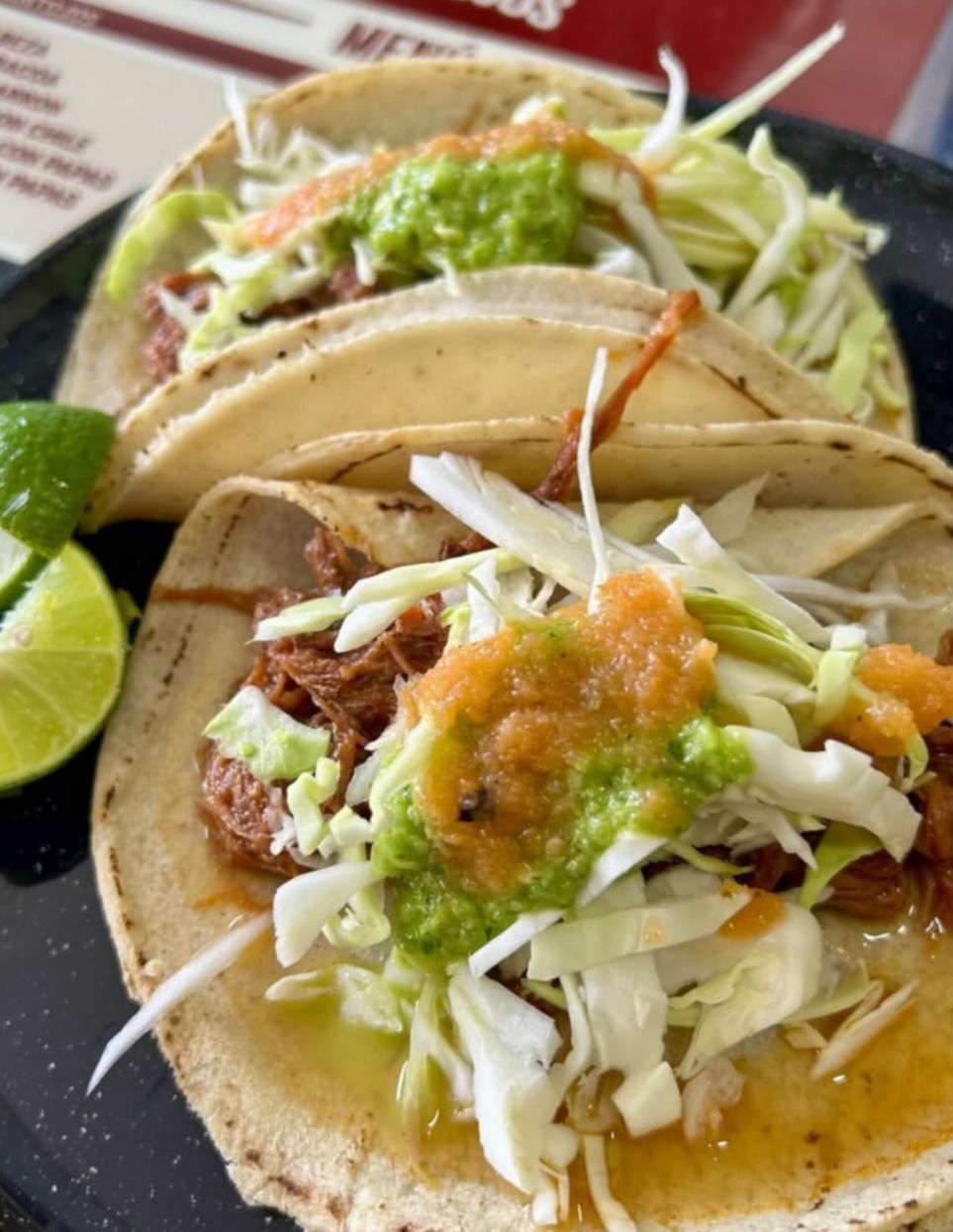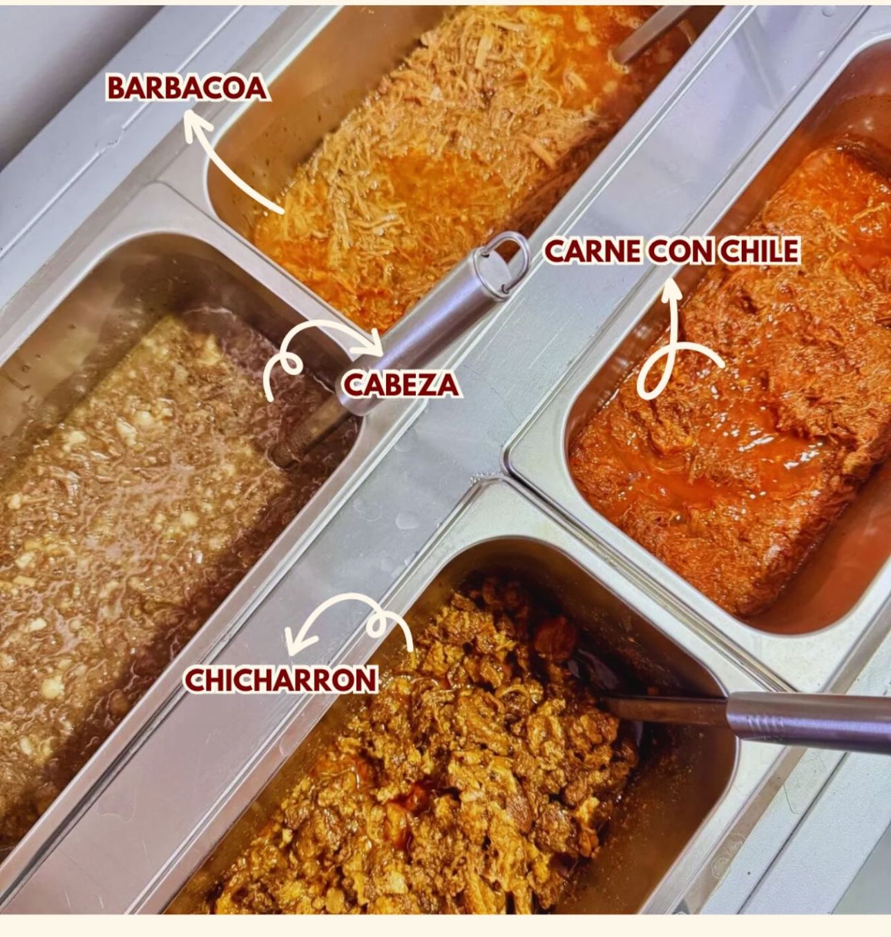 Con queso y frijol, cabeza, barbacoa, chicharrón, carne con chile, machaca con papas, chorizo con papas.