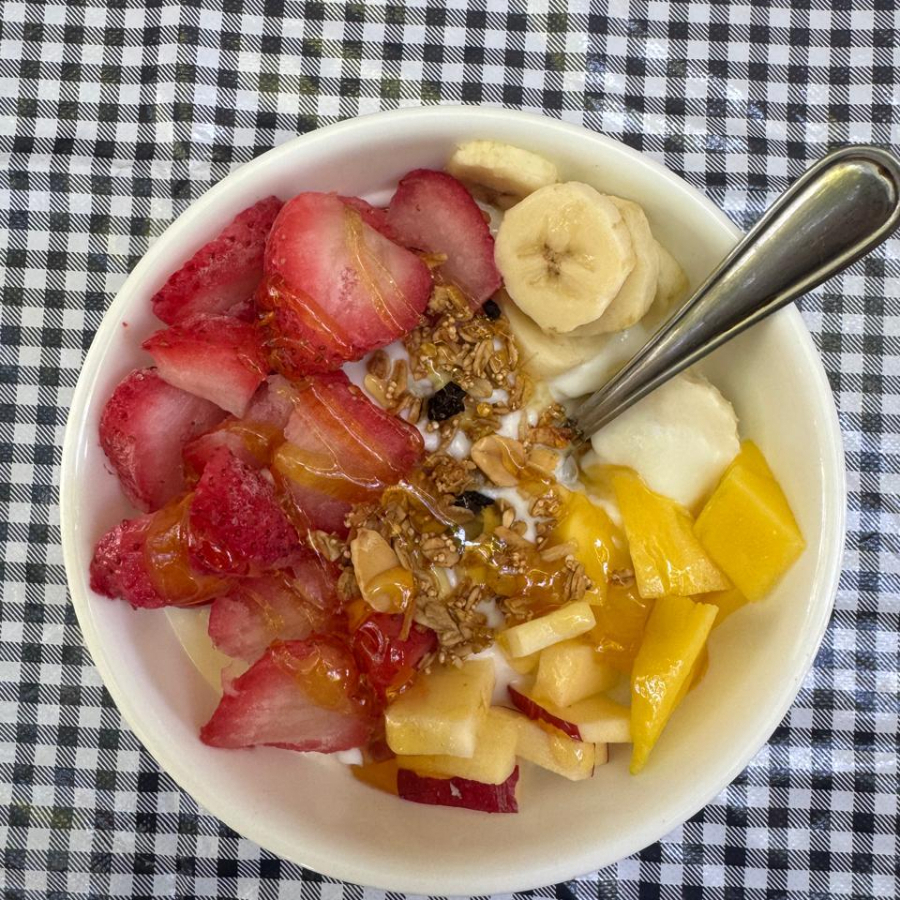 Combinado con fruta de temporada, granola, arándanos y pasas.
