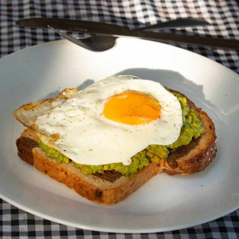 Un aguacate, una rebanada de pan artesanal, un huevo y salsa de la casa.