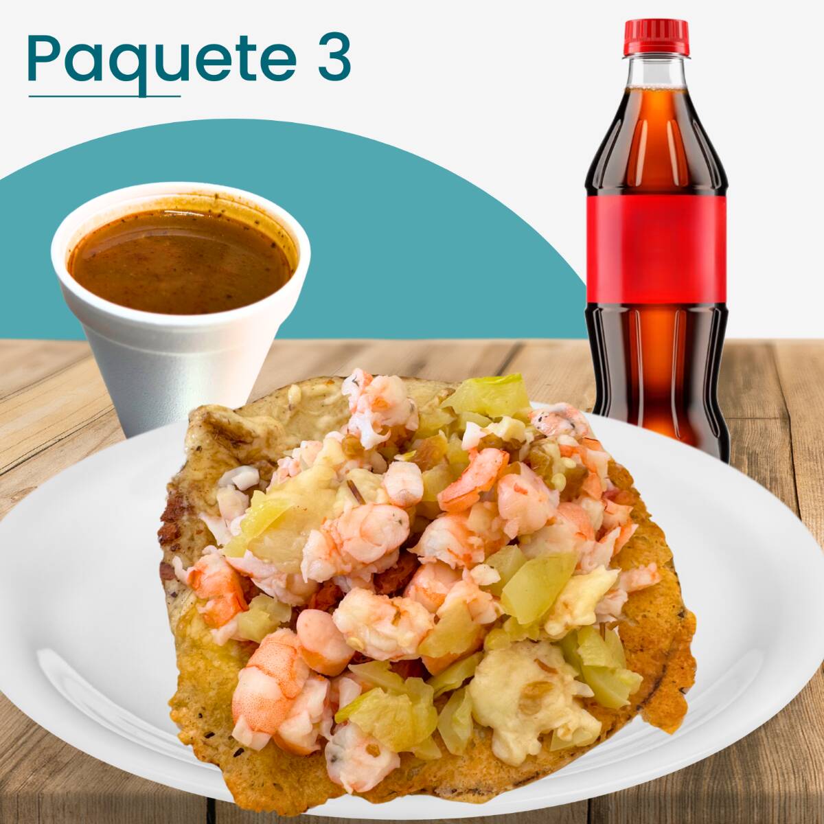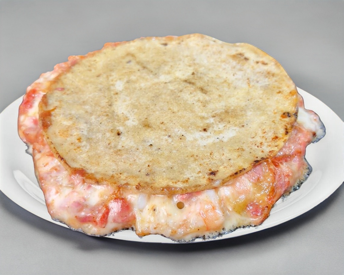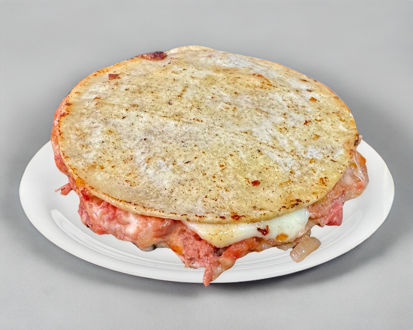 Tortilla de maíz con queso, camarón, chile serrano, tomate y cebolla.