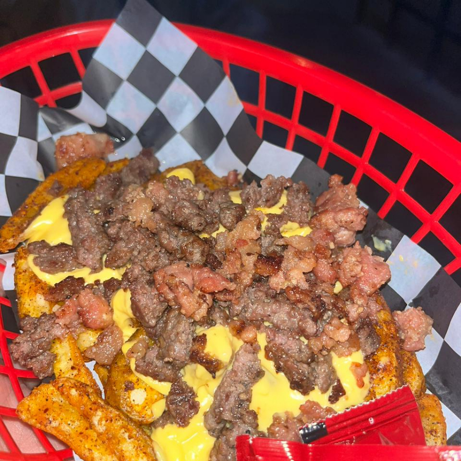 Orden de papas a elegir, queso cheddar, diezmillo de res molido, tocino, aderezo de la casa.