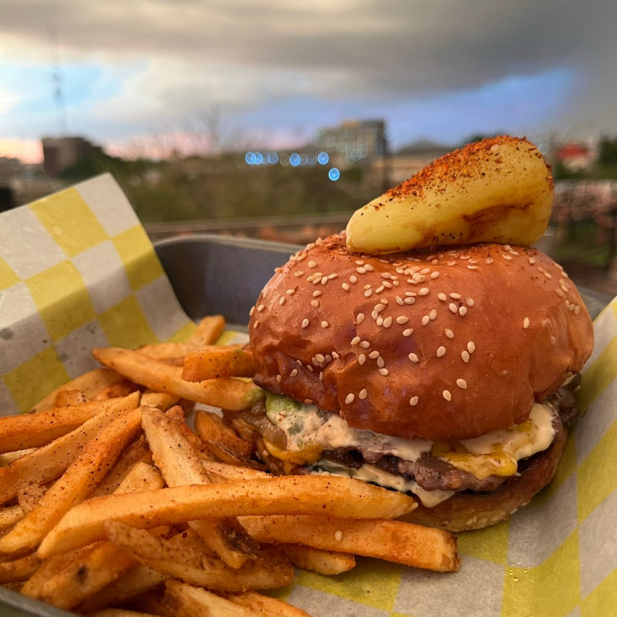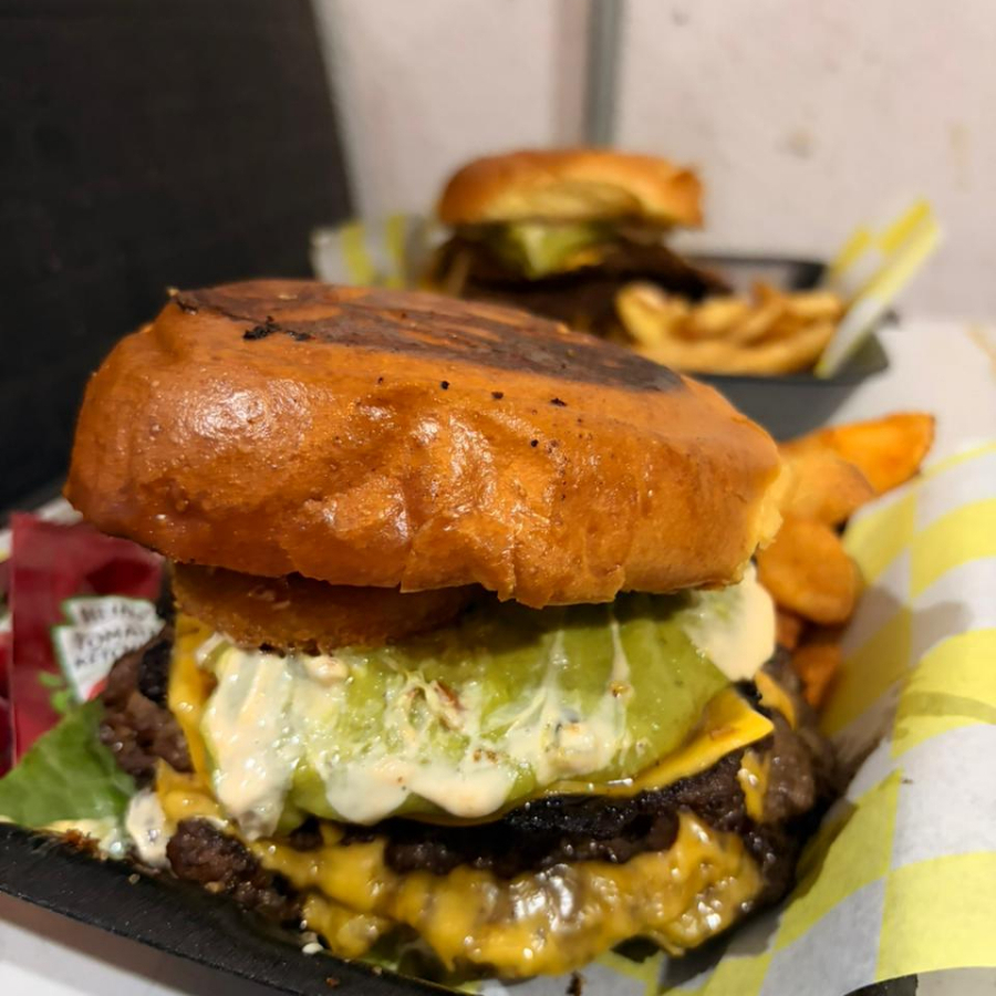 Hamburguesa de diezmillo de res con pan brioche, queso amarillo, mermelada de tocino, guacamole, chile verde tatemado , acompañada de papas a elegir