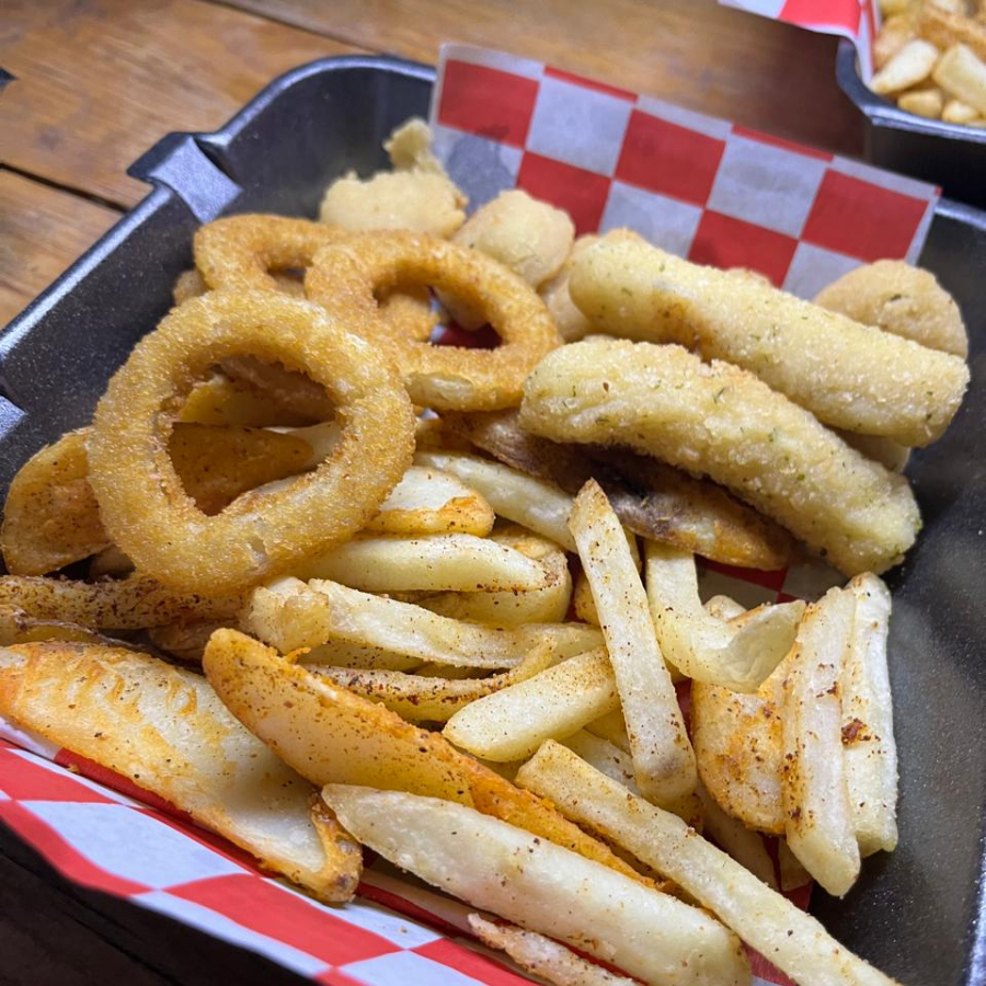 Paquete con papas a elegir, dedos de queso, aros de cebolla, bites de jalapeño, aderezo de la casa.