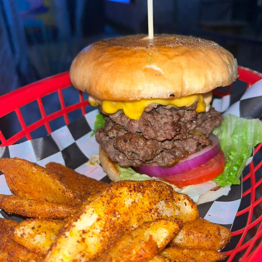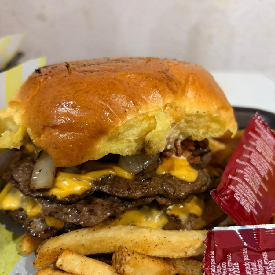 Hamburguesa de diezmillo de res con pan brioche,, doble queso amarillo, tocino, acompañada de papas a elegir.