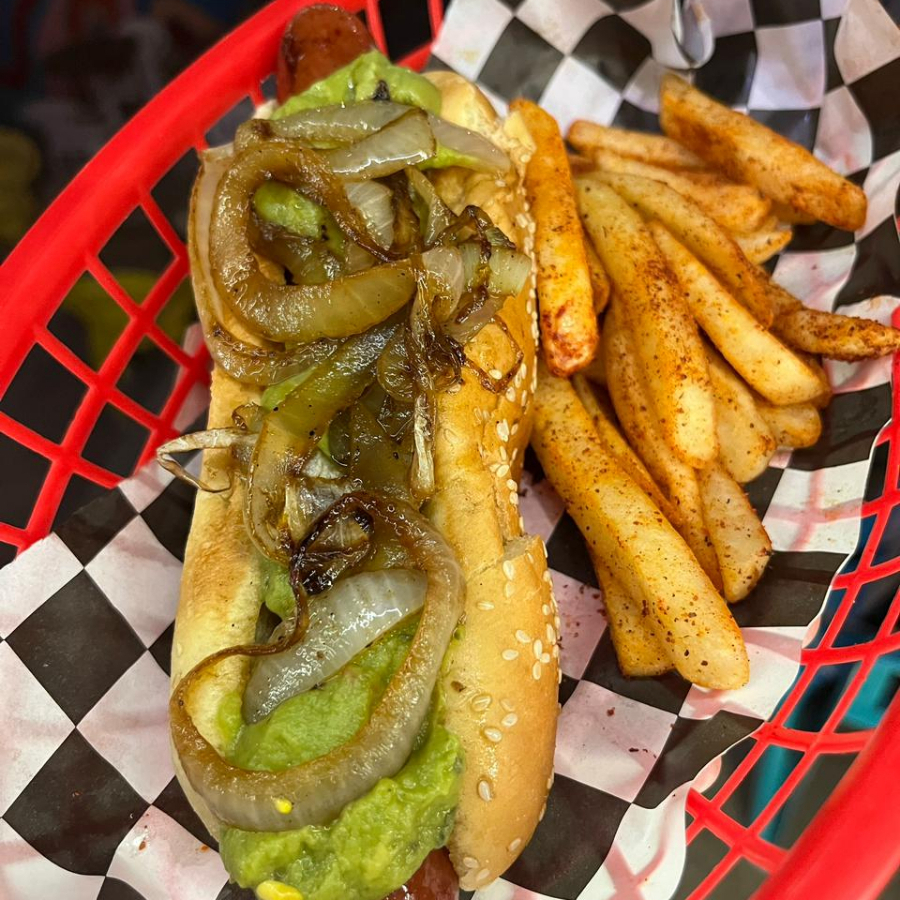 Pan de hot dog, salchicha de res, guacamole, cebolla caramelizada, acompañado de papas a elegir