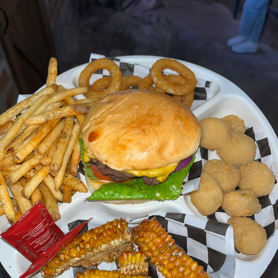 1 Hamburguesa clasica, 6 aros de cebolla, 1 orden papas a elegir, 150 gramos de kornstillas, 6 jalapeño bites.