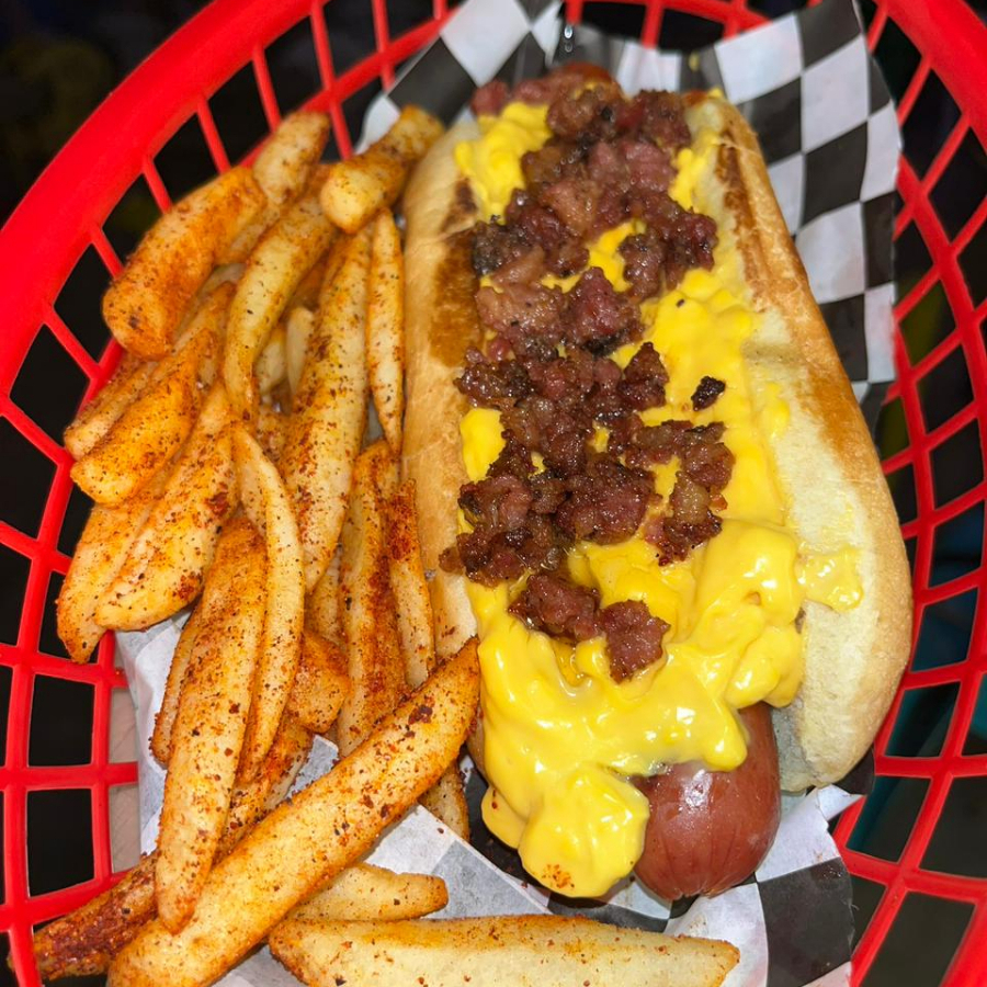 Pan de hot dog, salchicha de res, queso cheddar, mermelada de tocino, acompañado de papas a elegir
