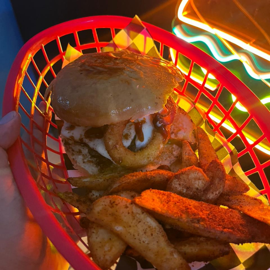 Hamburguesa de diezmillo de res con pan brioche, queso mozzarella, cebolla caramelizada, mermelada de tocino, aros de cebolla, salsa bbq; acompañada de papas a elegir