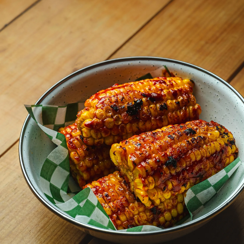 300 Gr de tiras de elote frito con mezcla de mantequilla y especias, aderezo de la casa.