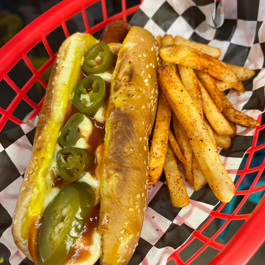 Pan de hot dog, salchicha de res, catsup, jalapeños, mayonesa, mostaza, acompañado de papas a elegir