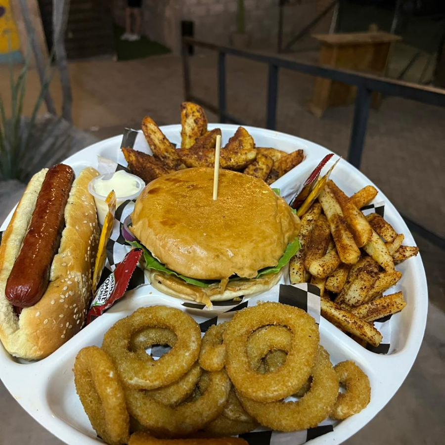 1 Hamburguesa clasica, 1 dogo americano, 1 orden de papas a elegir, 1 orden de aros de cebolla.