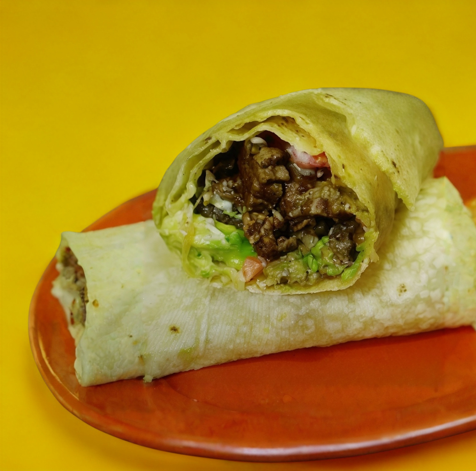 Tortilla grande, carne asada, salsa bandera, aguacate, queso Chihuahua, enrollado en tocino.