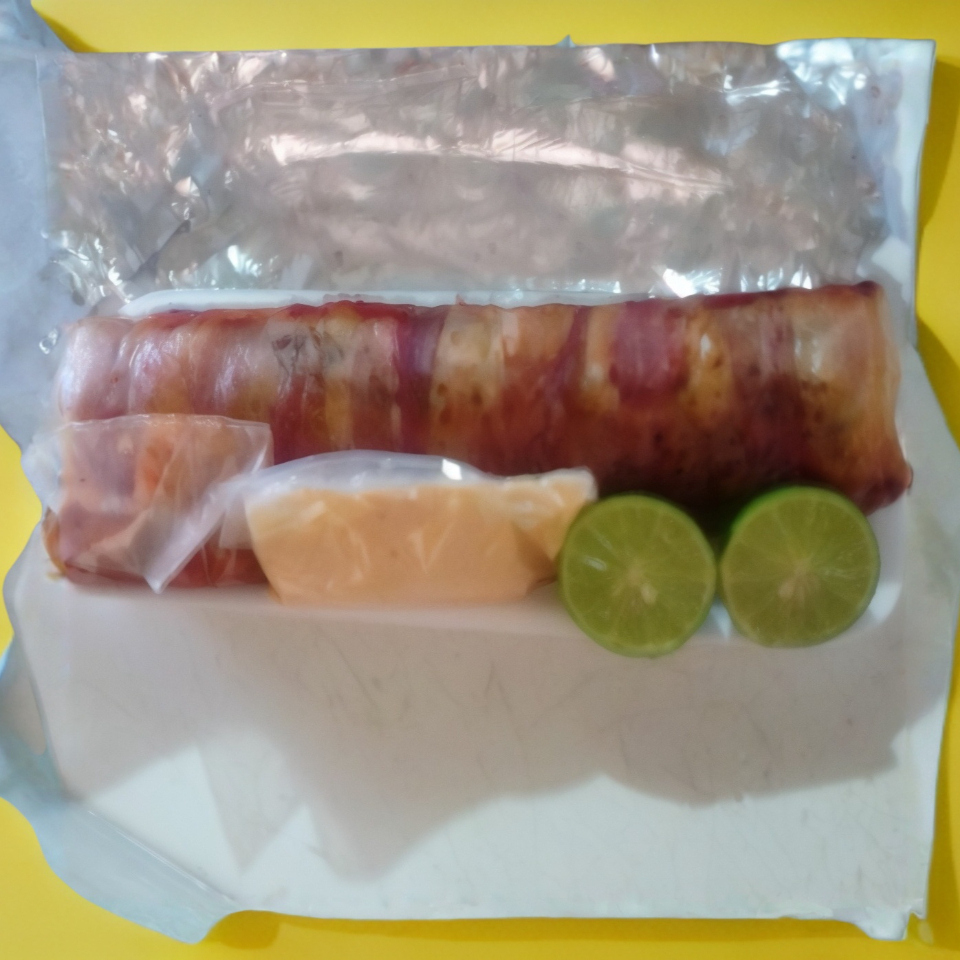 Tortilla grande, adobada, salsa bandera, aguacate, queso Chihuahua, enrollado en tocino.
