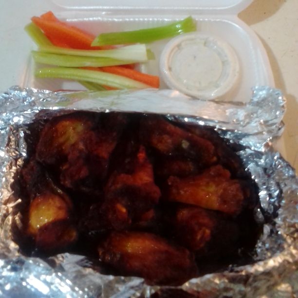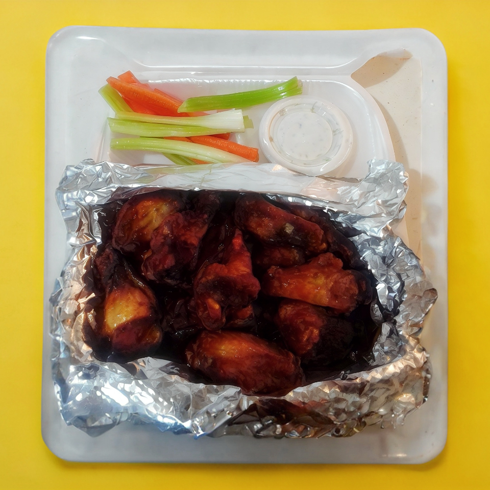 Alitas con salsa búfalo, apio, zanahoria y aderezo ranch.