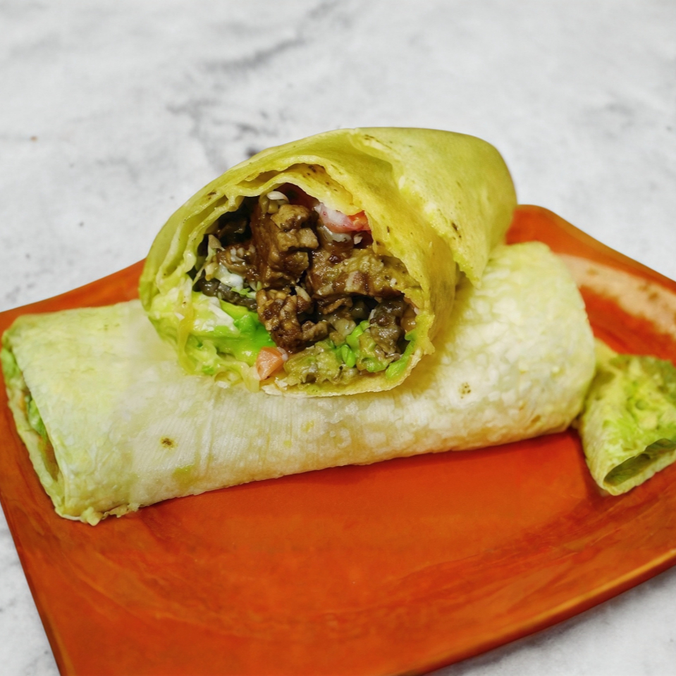 Tortilla grande, carne asada, salsa bandera, aguacate y queso Chihuahua.
