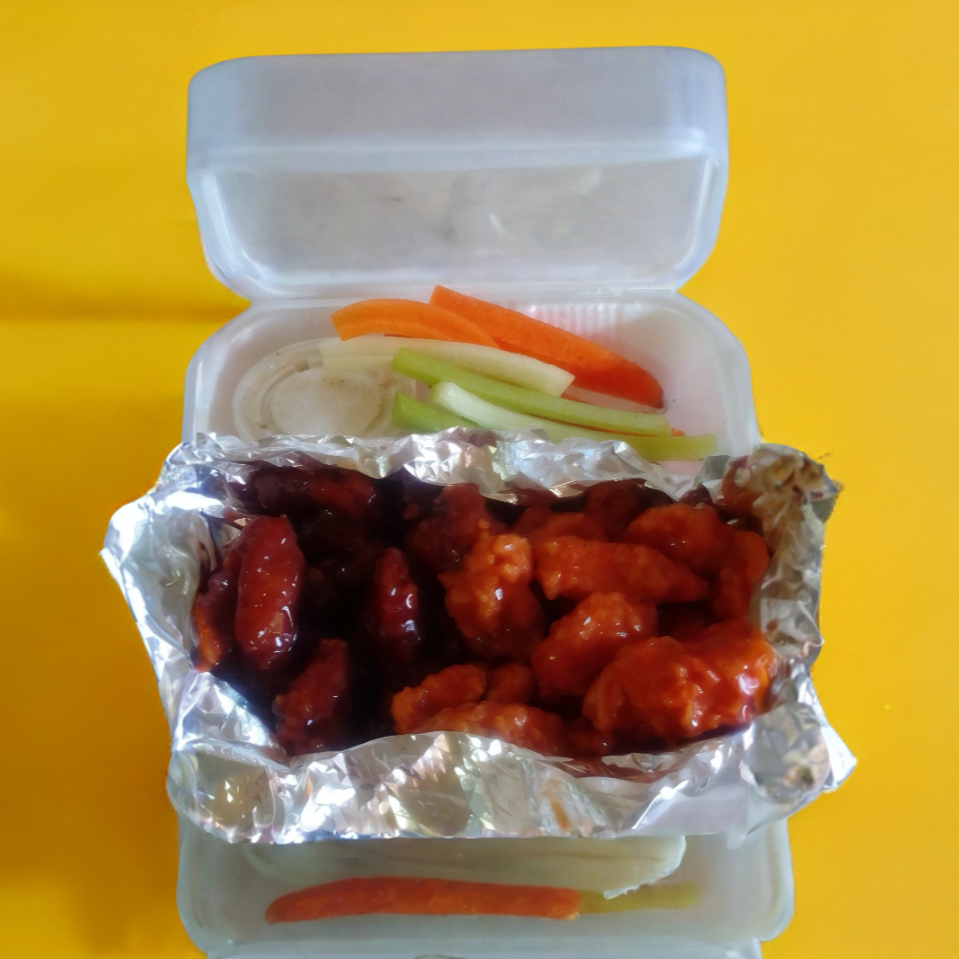 Tiras de pechuga empanizadas, bañadas en salsa BBQ, acompañadas en zanahoria y aderezo ranch.