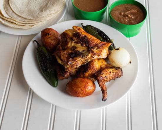 Medio pollo estilo Sinaloa con papas cambray, tortillas ( 300 gramos), chiles, cebollas, frijoles ( 70 gramos, una bolsa) y salsas.