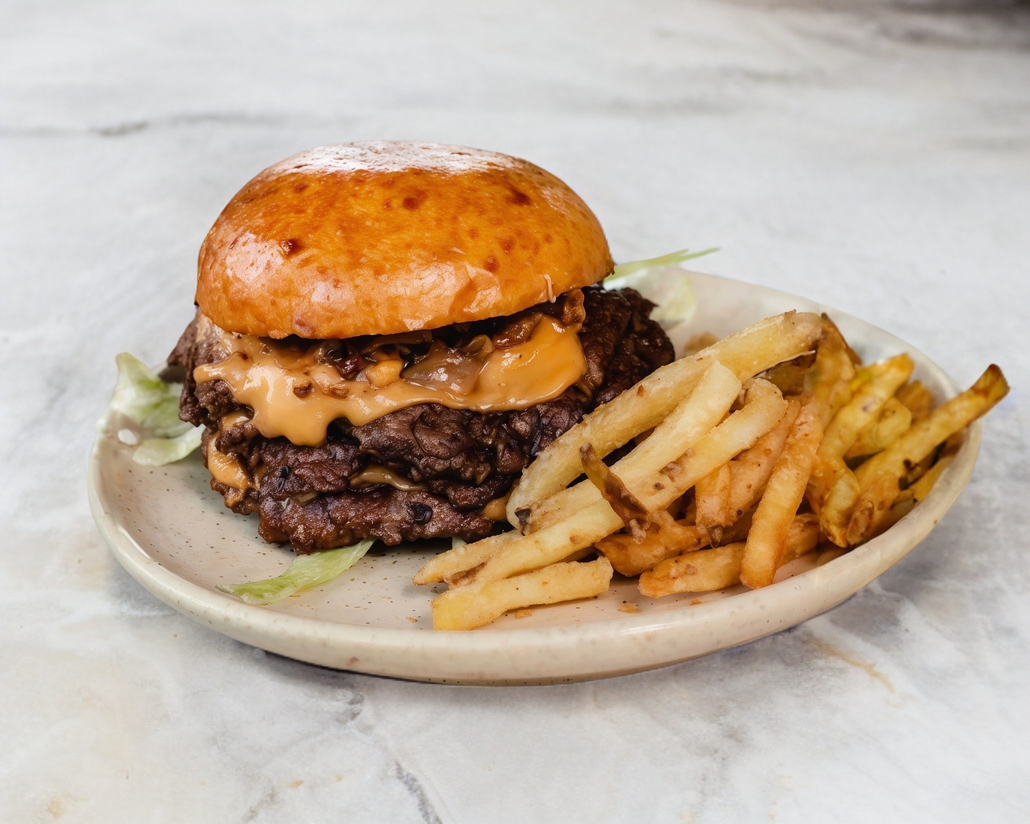 Pan Brioche, doble carne 100% Angus certificada, queso gouda, tocino, cebolla crispy, salsa BBQ, aderezo smash. Lechuga, tomate, cebolla, (opcional). Incluye papas a la francesa