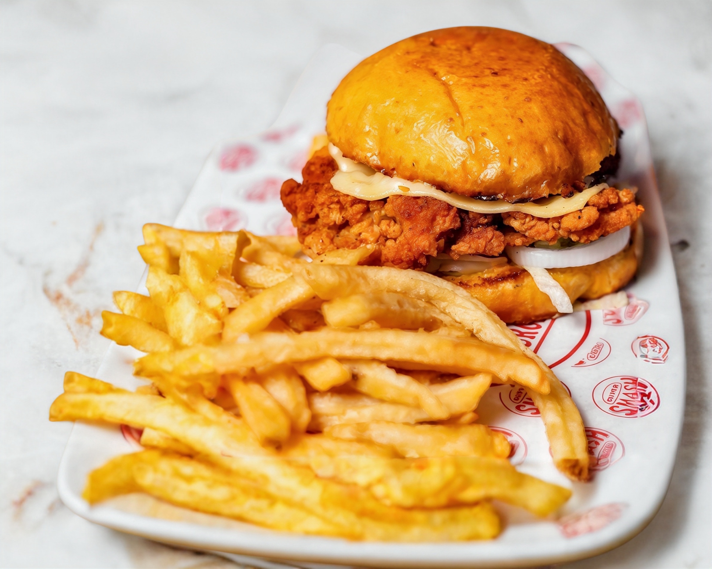 160 gramos de pechuga de pollo sazonada y empanizada. Pan Brioche, queso Gouda, aderezo smash. Lechuga, tomate, cebolla, (opcional). Incluye papas a la francesa.